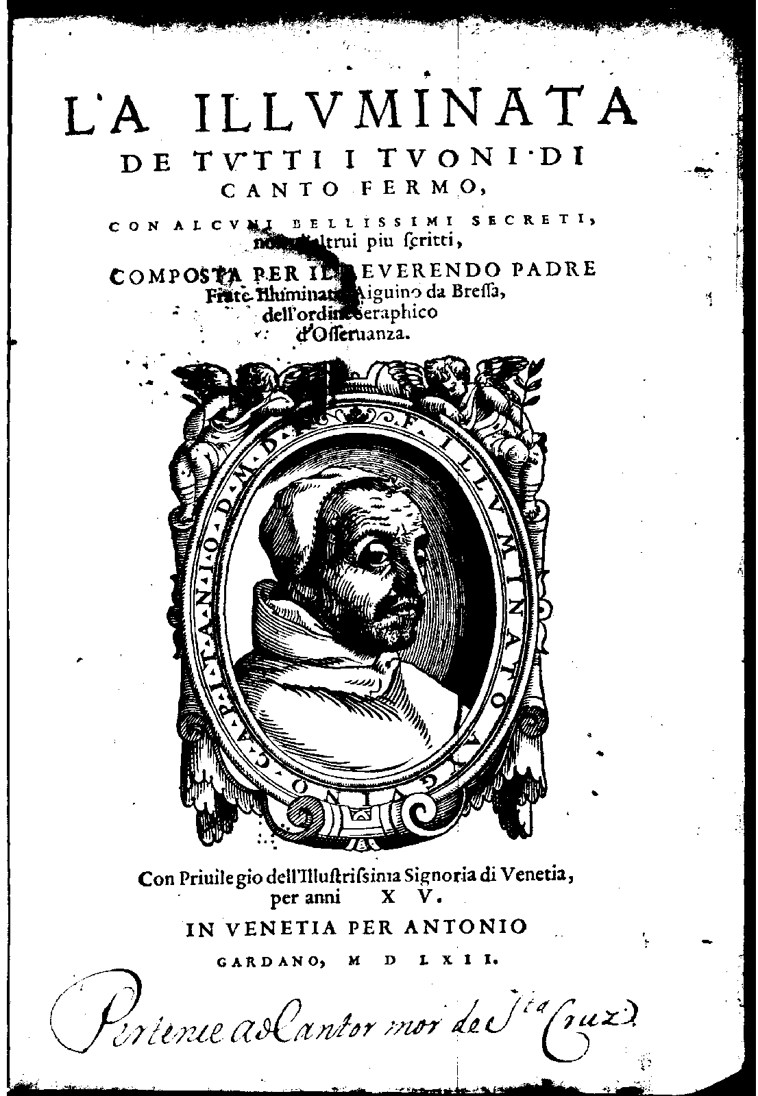 | Alternative. Title | La Illuminata de tutti i Tuoni di Canto Fermo, con alcuni bellissimi secreti, non d'altrui piu scritti, composta per il Reverendo Padre Frate Illuminato Aiguino da Bressa |