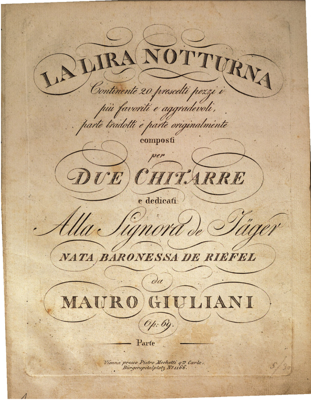 | Alternative. Title | La lira notturna continente 20 prescelti pezzi i più favoriti e aggradevoli ; parte tradotti e parte originalmente composti per due Chitarre |