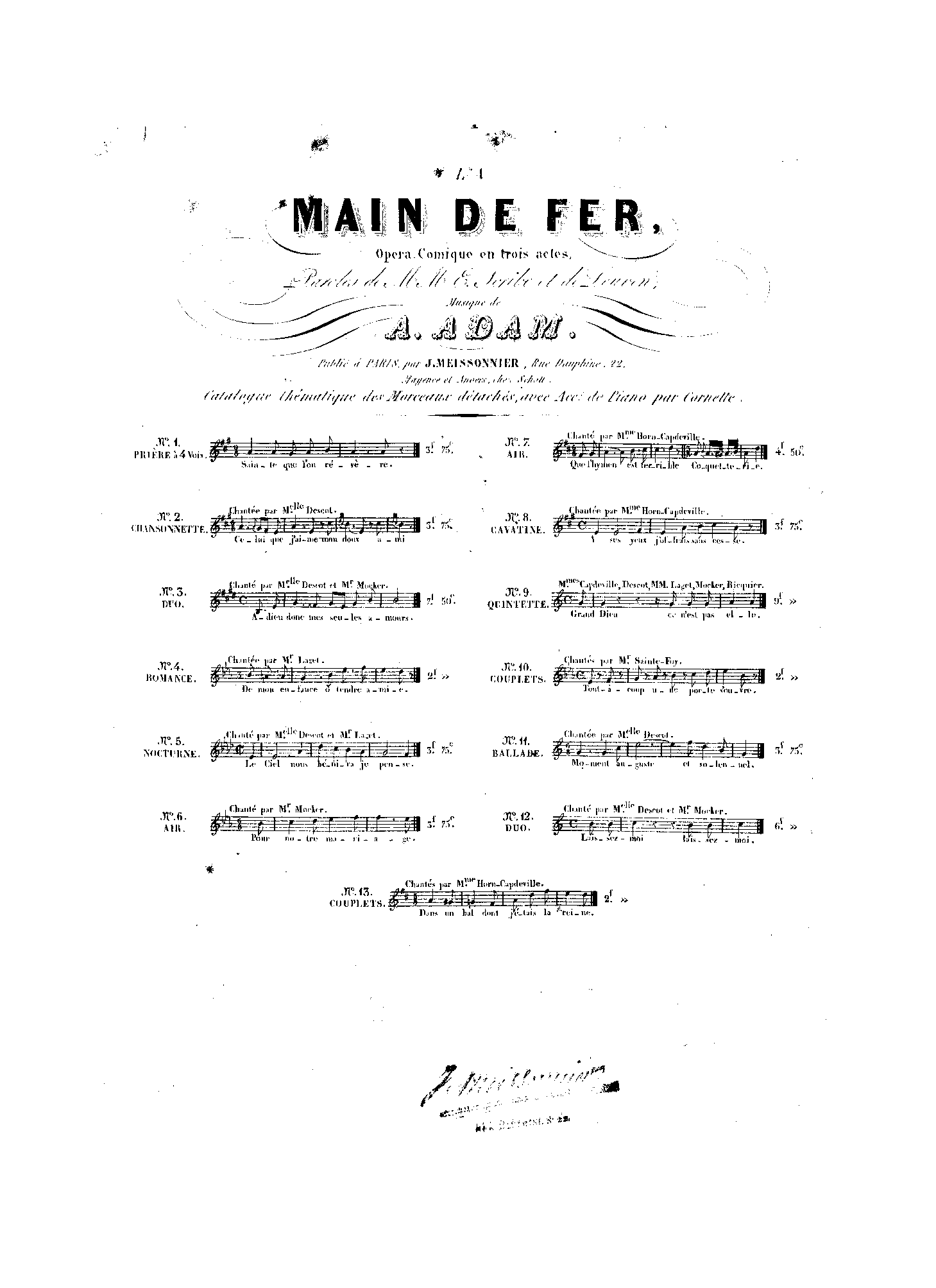 ⇒ 12 more: No.2, Chansonnette: "Celui qui j'aime, mon doux ami" (Bertha) • No.3, Duo: "Adieu donc mes seules amours" (Bertha/Nathaniel) • No.4, Romance: "De mon enfance, ô tendre amie" (Éric) • No.5, Nocturne: "Le ciel nous bénira, je pense" (Bertha) • No.6, Air: "Pour notre mariage, j'ai tout ce qu'il me faut" (Nathaniel) • No.7, Air: "A quoi bon la toilette" (Dorothée) • No.8, Cavatine: "À ses yeux j'offrais sans cesse" (Dorothée) • No.9, Quintette: "Grand Dieu! ce n'est pas elle" (Dorothée/Bertha/Éric/Nathaniel/Œgidius) • No.10, Couplets: "Tout à coup une porte s'ouvre" (Job) • No.11, Ballade: "Moment auguste et solennel" (Bertha) • No.12, Duo: "Laissez-moi, ne suivez point mes pas" (Bertha/Nathaniel) • No.13, Couplets: "Dans un bal dont j'étais la reine" (Dorothée)