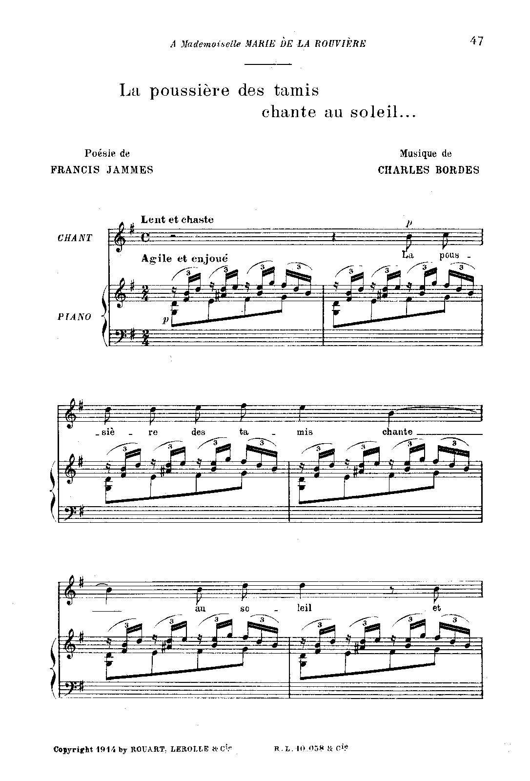One of 4 poems to texts by Jammes composed by Bordes in 1901 and premiered in 1902 (various singers for the 4 poems, the quartet of the Chanteurs de Saint-Gervais), recorded on Timpani 1C1208 (2013). First published in 1902.
