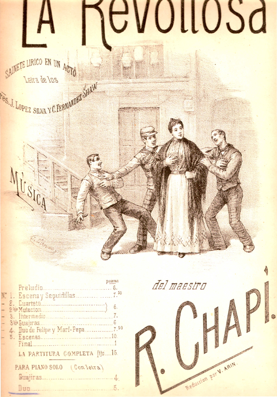 The zarzuela La revoltosa is unrolled in the epoch of the premiere (1897) in a neighbors court of Madrid. I put in November 27,1897 in the theatre Apolo, there was present af the premiere the famous composer Camille Saint-Saëns, it is said on that after listening to the duo of Felipe and Maripepa commented...Since it is possible that in Spain they call this do I"Genero chico"?
