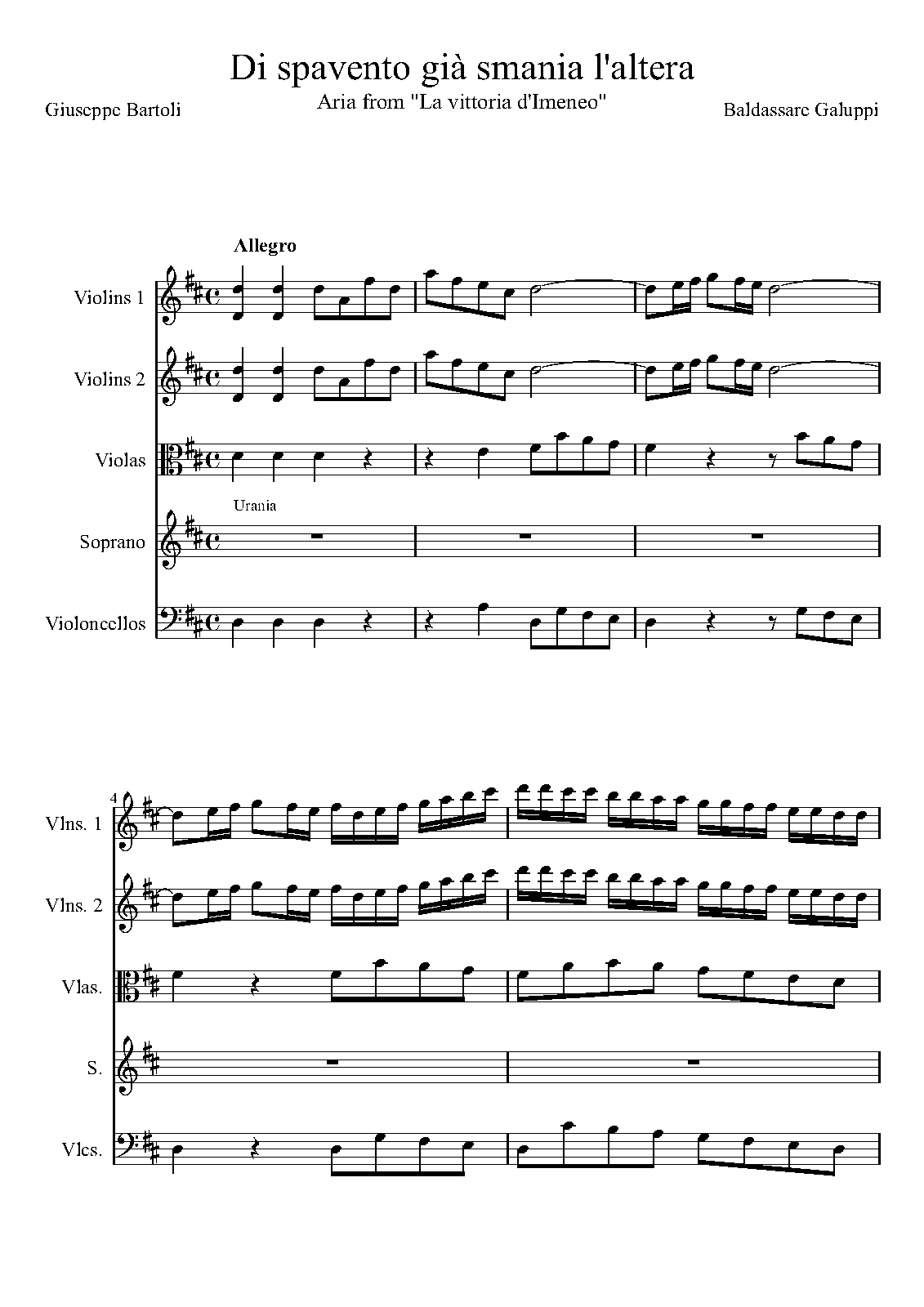 Source: Aria collection in Biblioteca del Conservatorio di San Pietro a Majella, Napoli. - Caution: Vocal range from d to d'''. The role of Urania was created by Giovanna Astrua, one of the leading sopranos of the time. - Handel borrowed thematic material for two arias in "Jephtha" from this Galuppi aria: From the A section ("Freely I to heav'n resign") as well as from the B section ("Sweet as light to the blind").