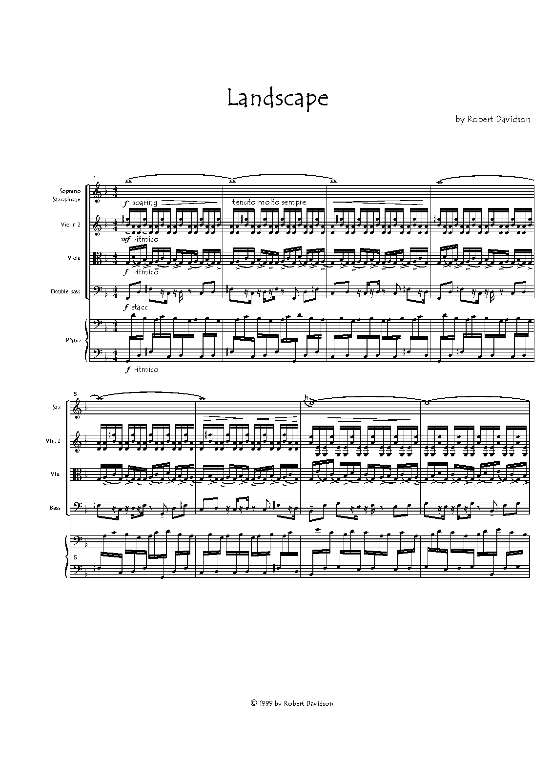 Program Note: Landscape was commissioned by Ensemble 24 and was premiered on their 2000 Asian tour. The area around the Glasshouse Mountains in southeast Queensland is the inspiration for the work. This is a landscape dominated by boldly shaped mountains, possessing for me a sense of great age and a certain violence - these mountains were once inside volcanoes. There is a great variety of topography in Landscape's landscape, including large placid lakes, ocean, wide plains, rainforest and scrubby bush. The music reflects this diversity with a range of contrasting textures.