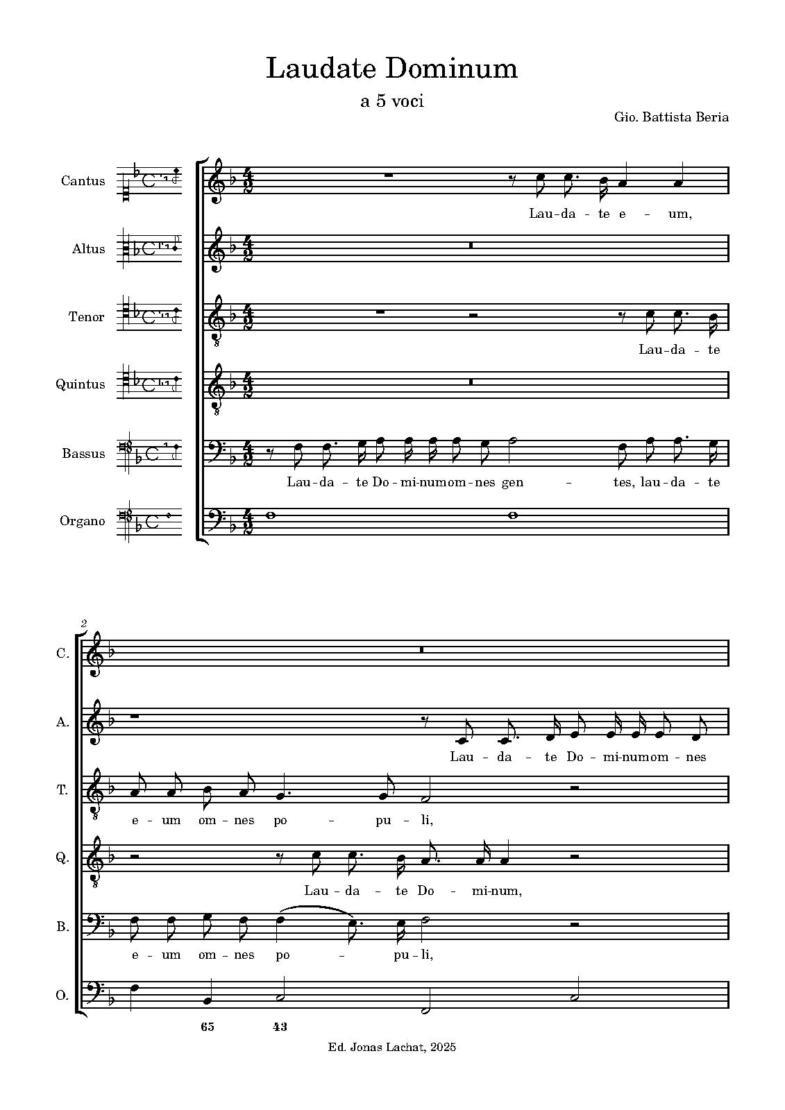 | Extra Information | From the collection: Giovanni Battista Beria, Concerti musicali, messa, salmi a cinque e a tre voci per le domeniche, feste della B. V. e delli apostoli con Litanie, e motetto a 5., libro primo, opera IV, Milano, fratelli Camagni, 1671 (RISM A/I B 2029, ID No.990004821). |