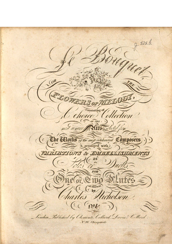 | Alternative. Title | Le Bouquet, or the Flowers of Melody, consisting of a choice collection of the most admired airs selected from the works of the most celebrated composers & arranged with variations & embellishments as solos or duetts for one or two flutes ad libitum |