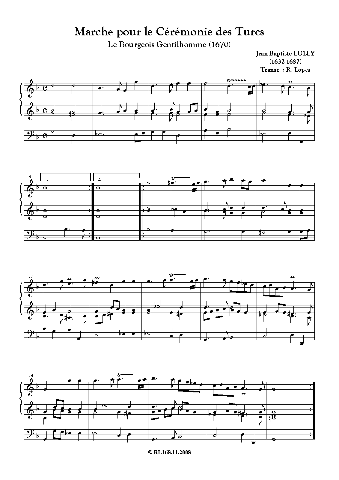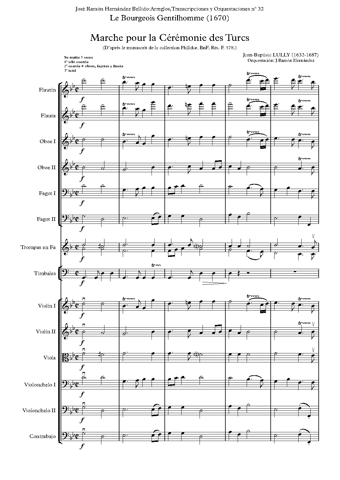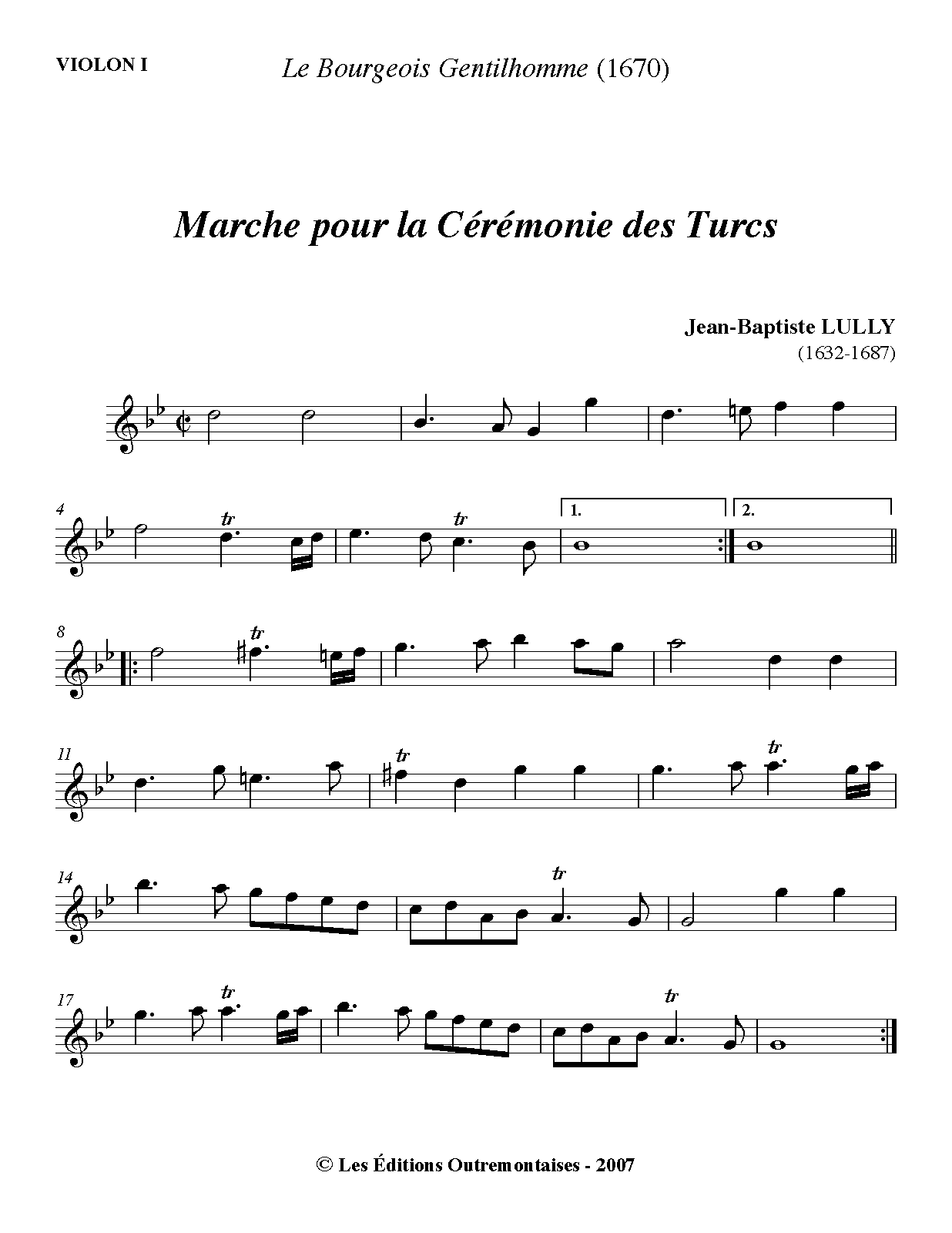 ⇒ 11 more: 1. Overture • 2. Gravement • 3. Sarabande • 4. Bourée • 5. Gaillarde Canarie • 6. Gavotte • 7. Louré • 8. Air des Espagnoles • 9. Menuets 1 et 2 (2 = Menuet pour les hautbois des Poitevins) • 10. Chaconne des Scaramouche, Trivelins • 11. Marche pour la ceremonie des Turcs