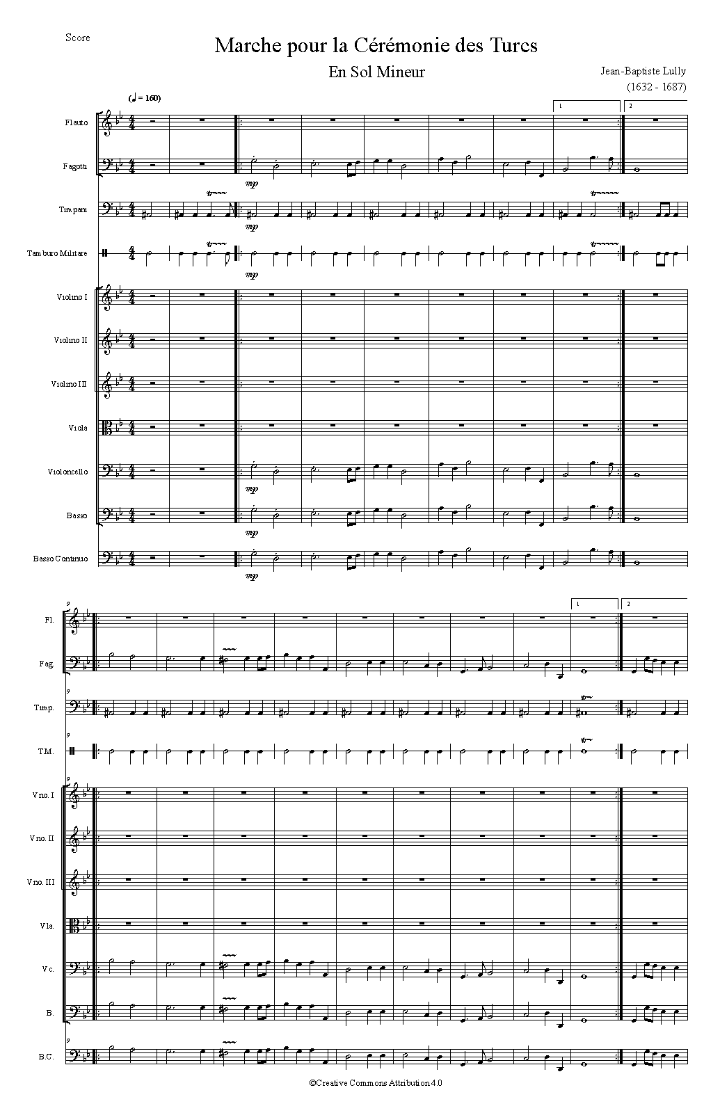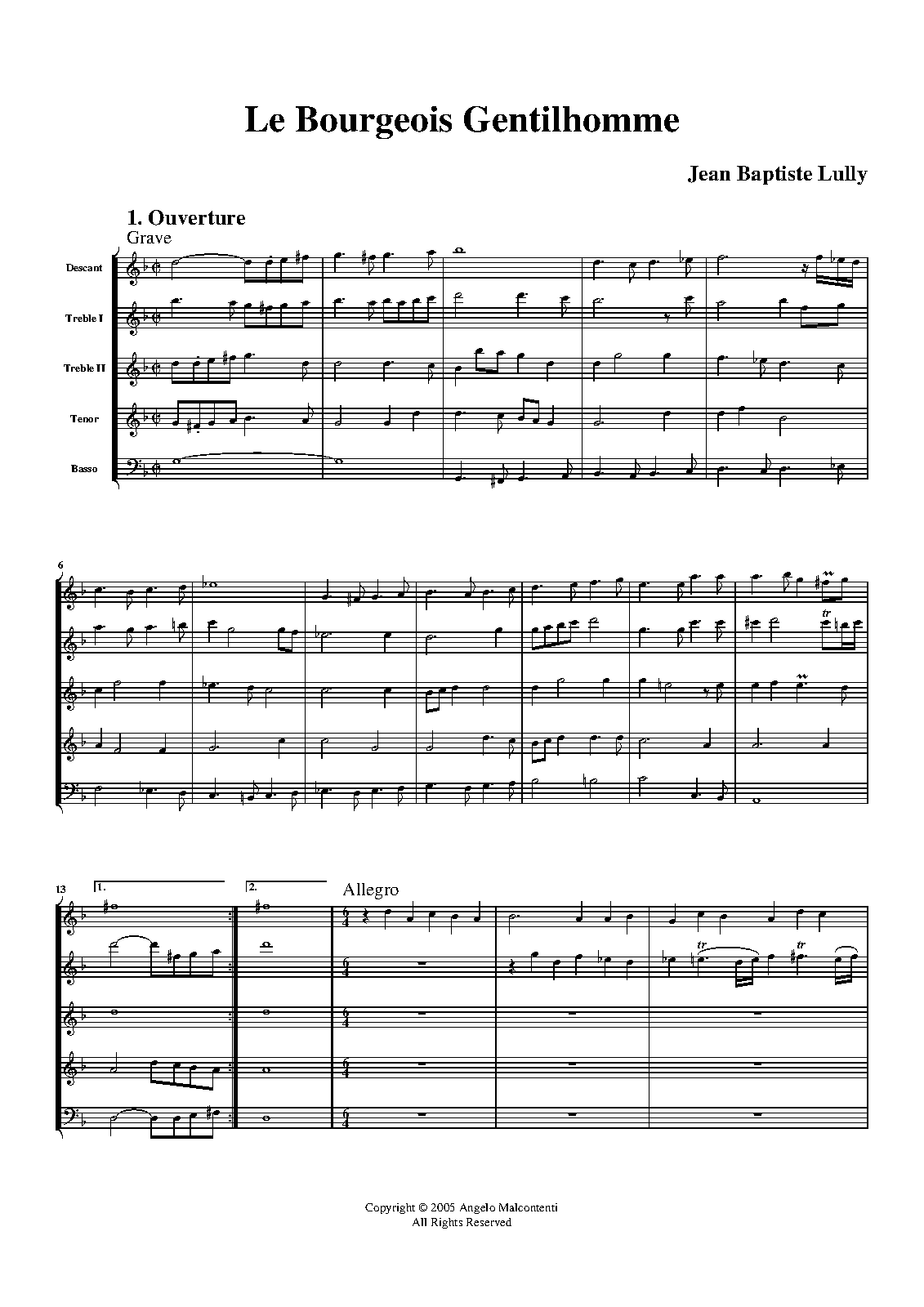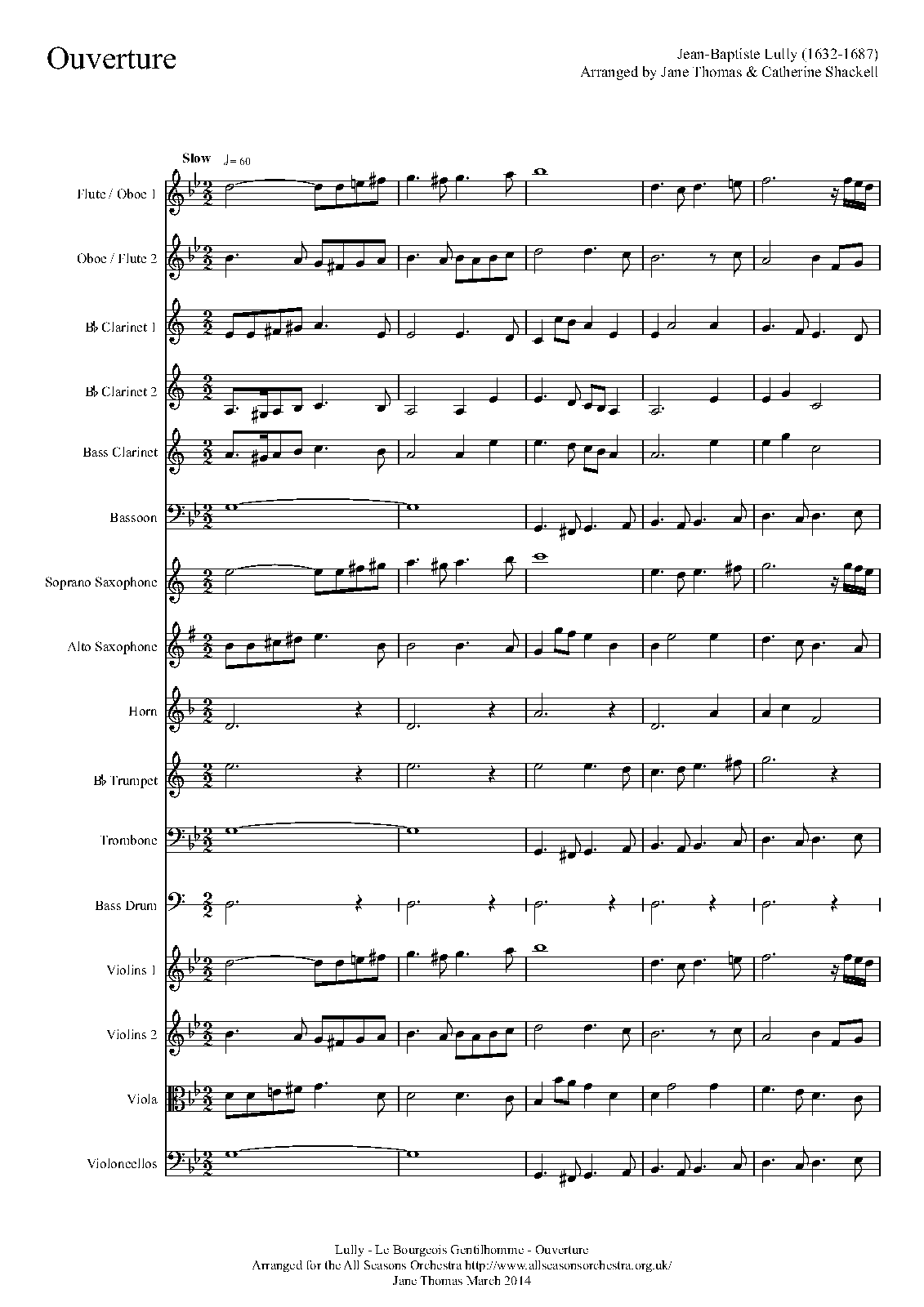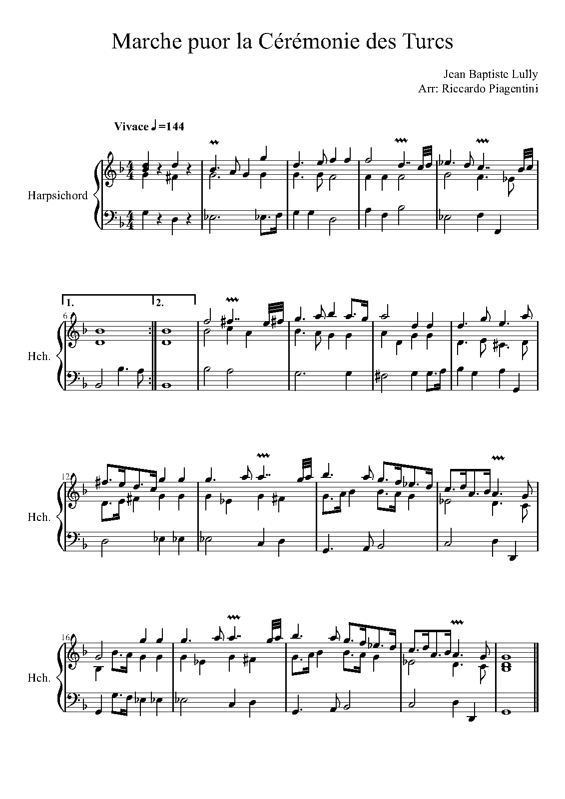 ⇒ 11 more: 1. Overture • 2. Gravement • 3. Sarabande • 4. Bourée • 5. Gaillarde Canarie • 6. Gavotte • 7. Louré • 8. Air des Espagnoles • 9. Menuets 1 et 2 (2 = Menuet pour les hautbois des Poitevins) • 10. Chaconne des Scaramouche, Trivelins • 11. Marche pour la ceremonie des Turcs