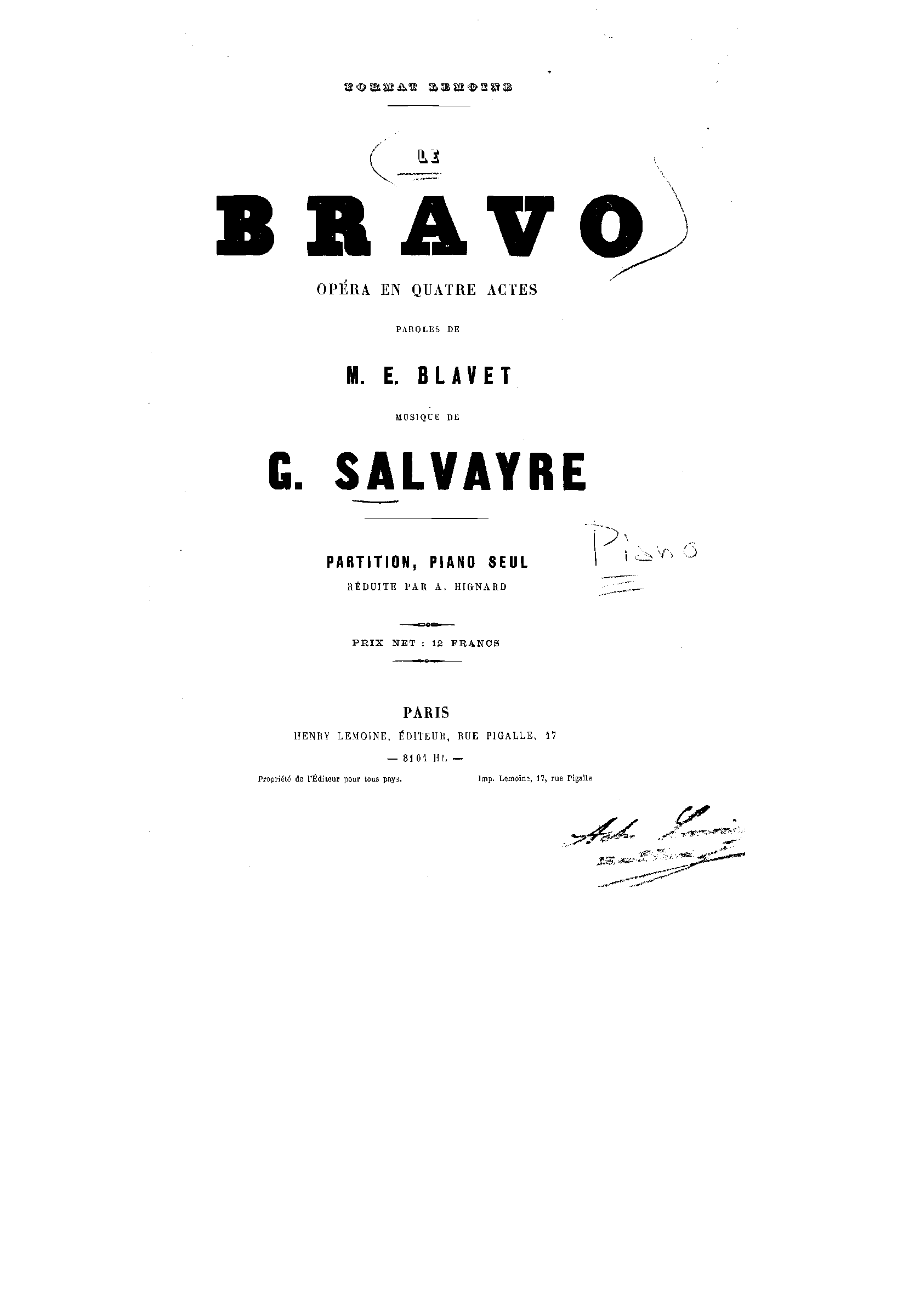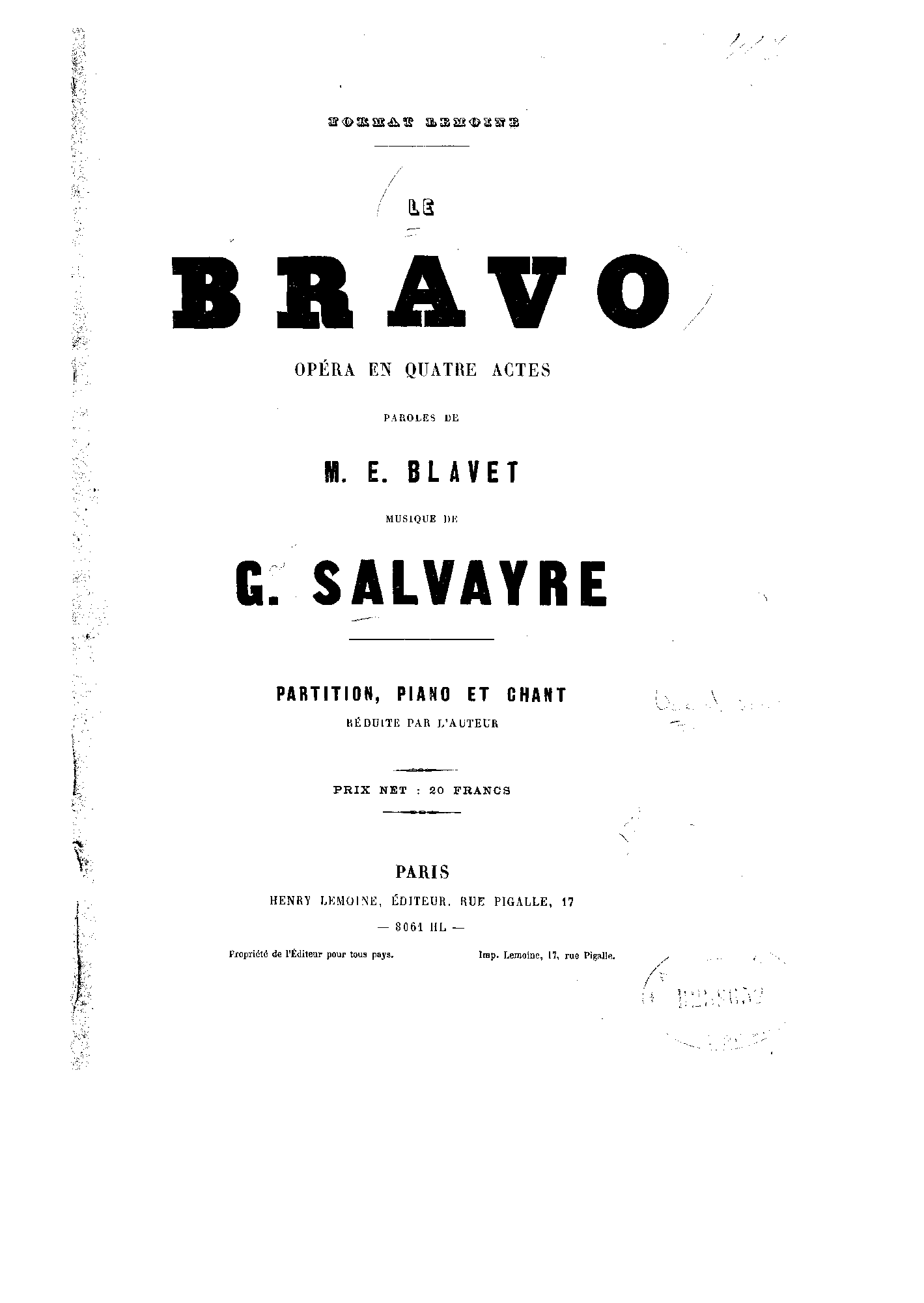 | Dedication | A Albert Vizentini, Directeur de l'Opéra National Lyrique |