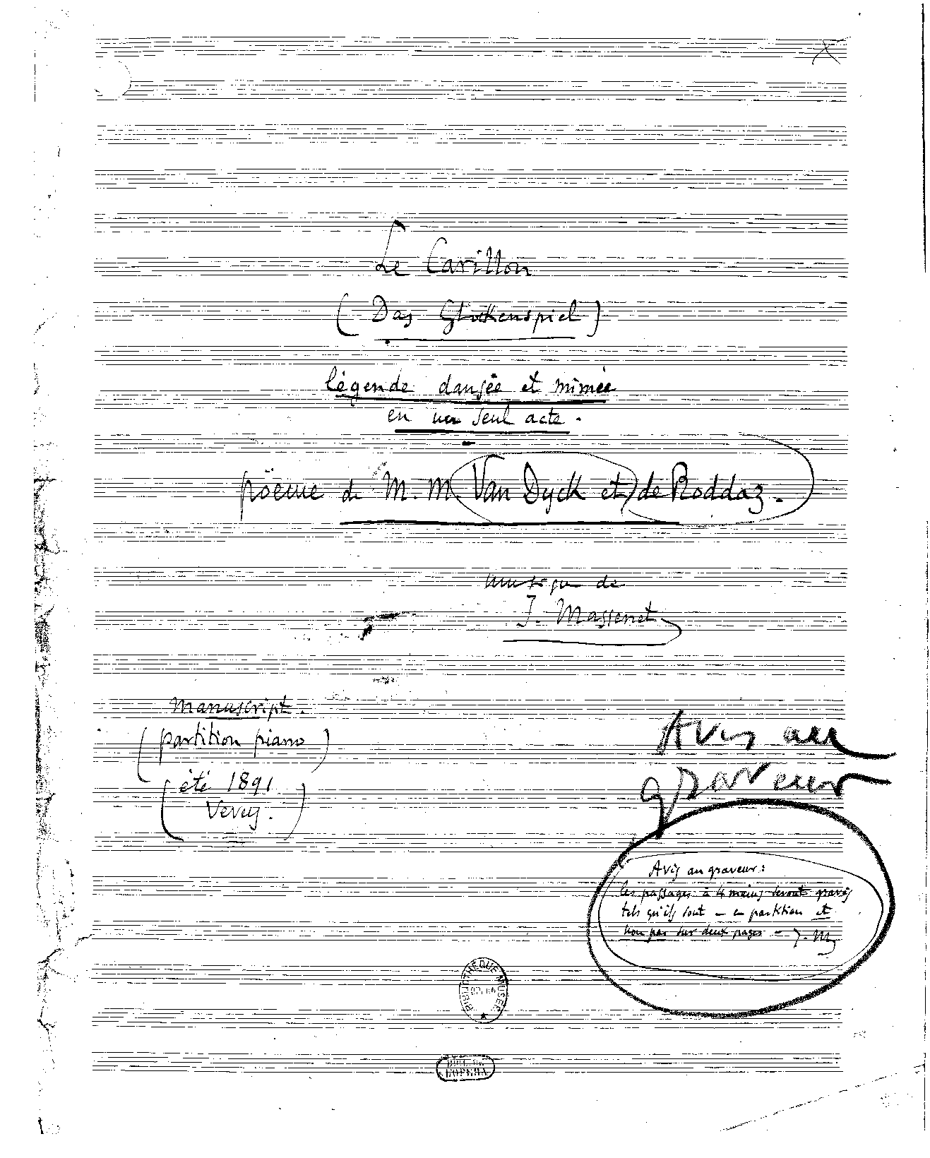 Dated 9 August 1891, in the Grand Hôtel de Vevey (Switzerland). Used to engrave the piano score uploaded below. This file is based on high-resolution images obtained from BNF using a method explained on this page. Converted to monochrome, de-skewed, set to uniform size and optimized.