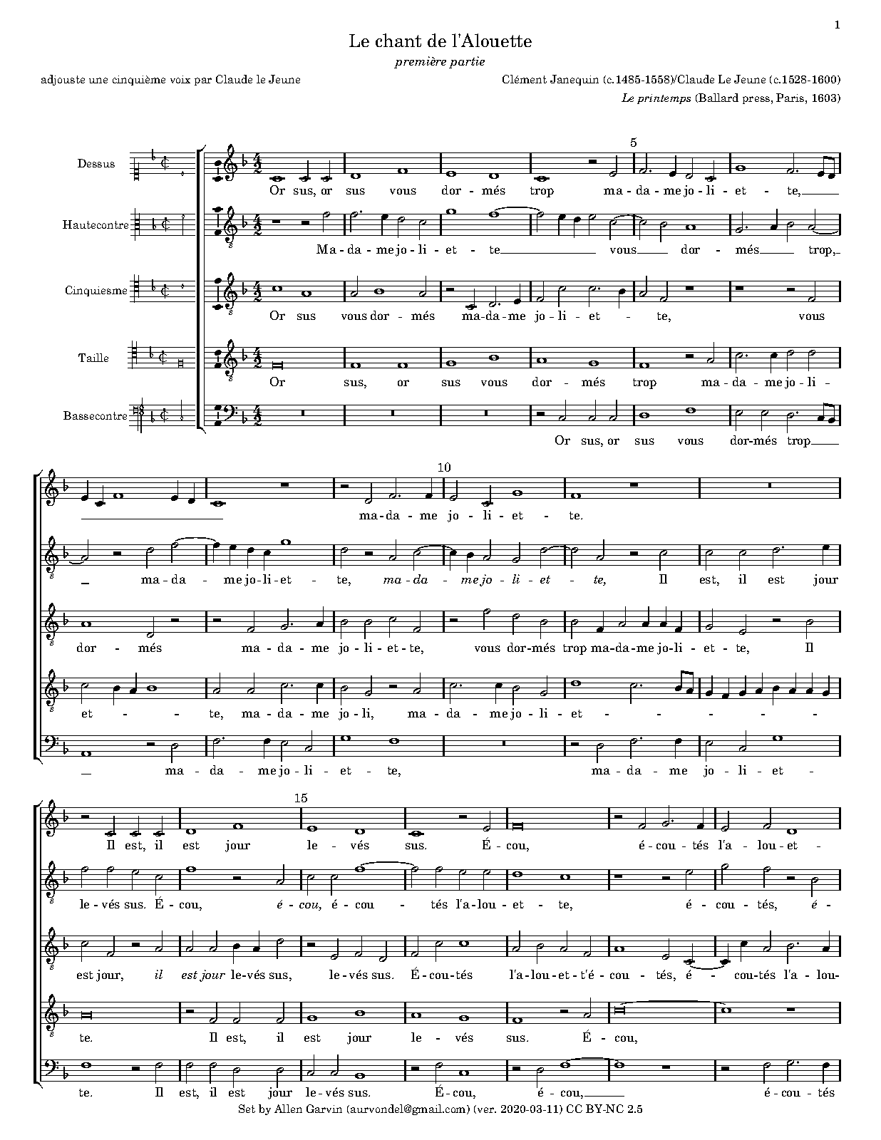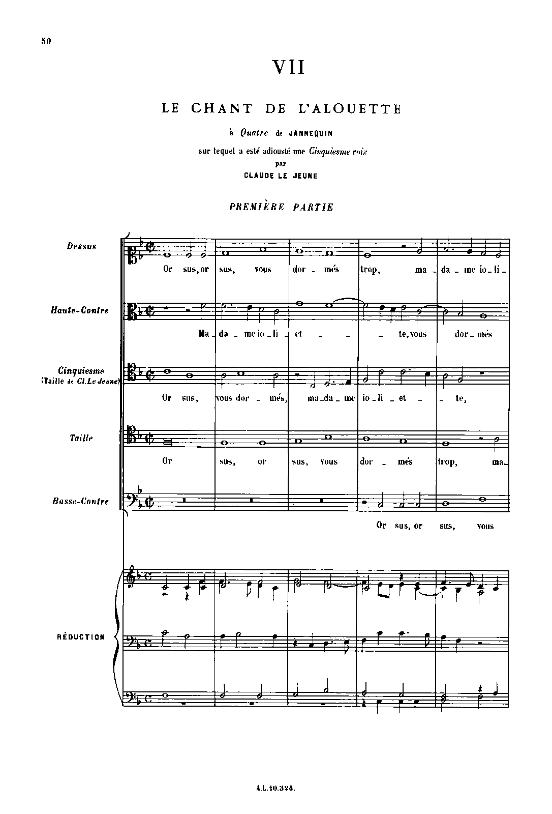 This is explicitly a reworking of Janequin's famous 4-voice chanson of the same name into a longer piece for 5 voices.