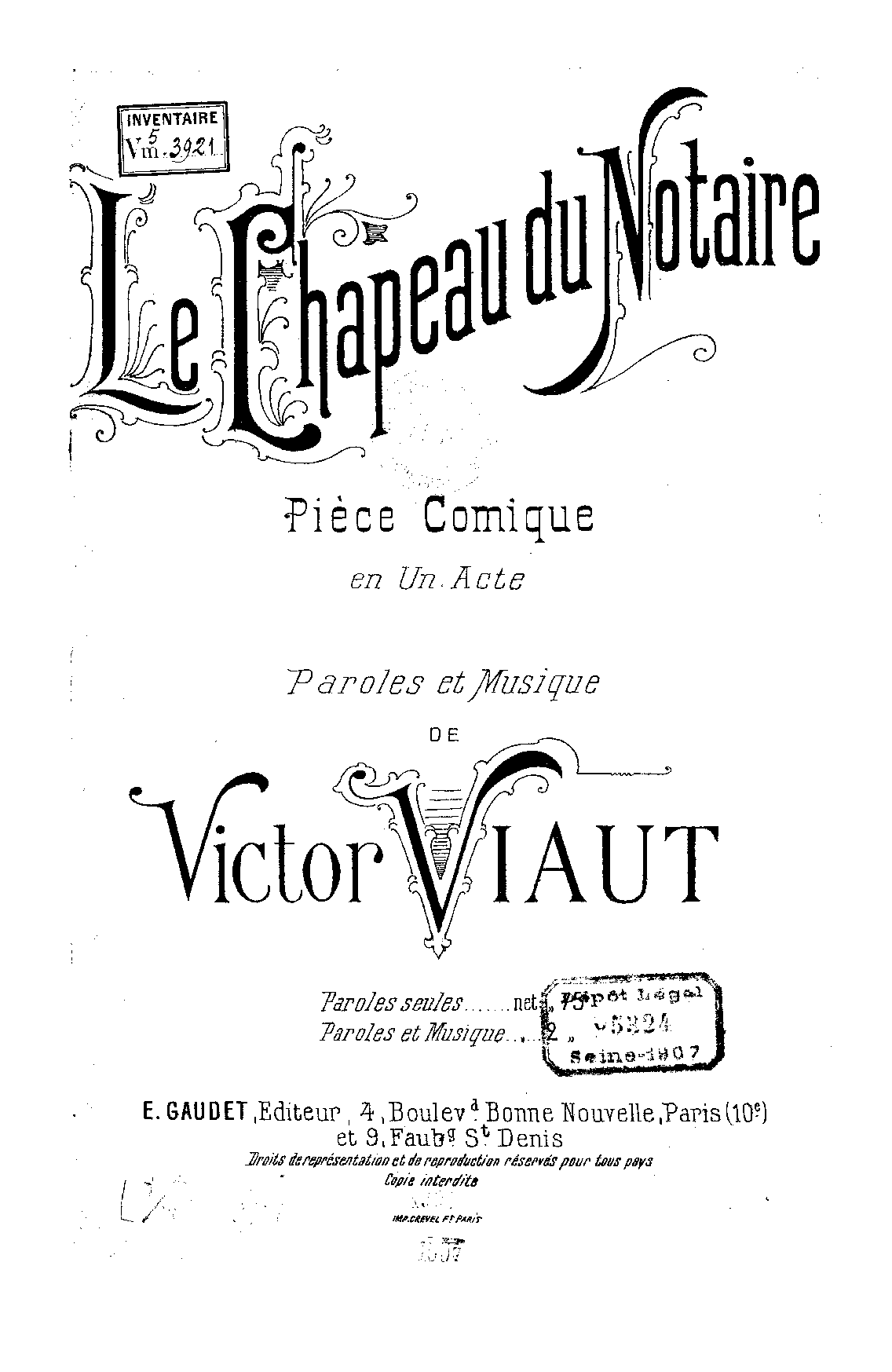 | Copyright Information | Publication noted in the Bibliographie de la France : 96e année, 2e série, Nº 24, 14 Juin 1907, p.368, reg.3838 (vocal score). |