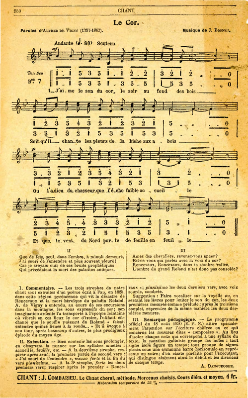 From the uploader's family archives (origin : Philippe Besset). Flimsy yellowed page.This singing lesson written by J.Bonnet (some uncertainty here, Bonnet being a common name, it could apply to someone else), was published in one of the practical lessons manuals that were intended for schoolmasters under the label Leçons de choses. The text used to illustrate the singing lesson is one of the most famous poems in the French literature, and well known to pupils and the general public. The second page is not musical in character and proceeds with explanations relating to experiments in physics, or, as they are termed in French, travaux dirigés.