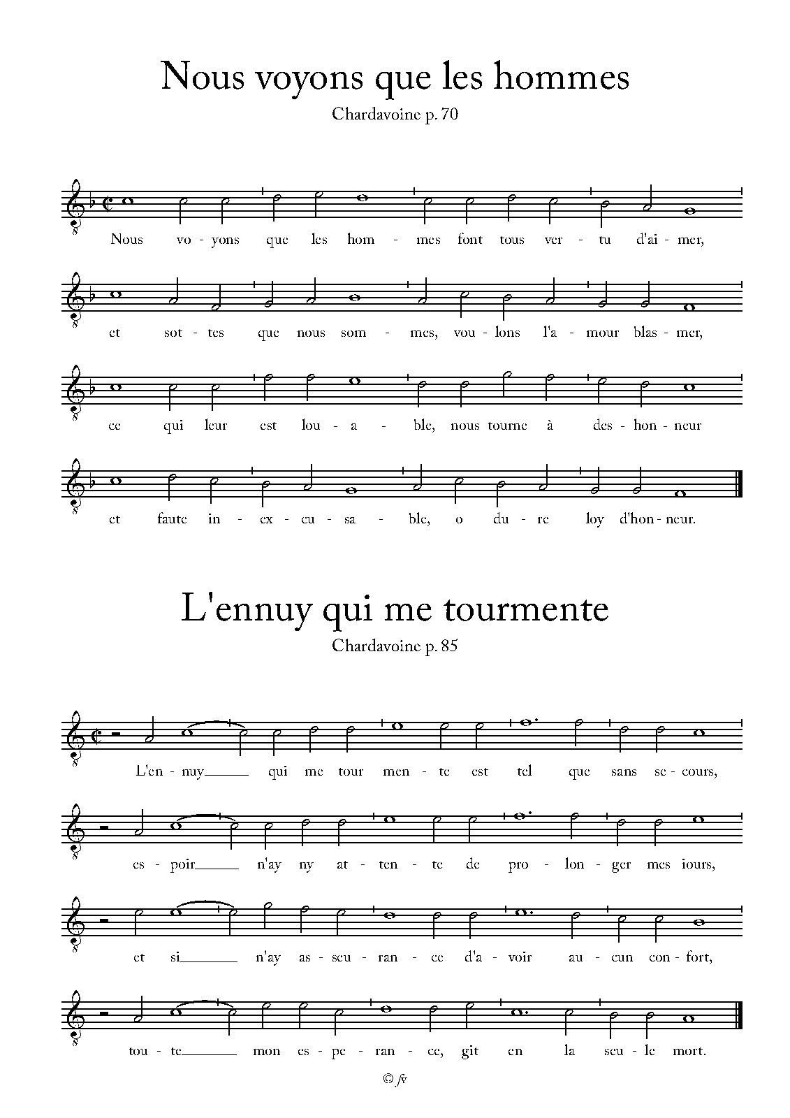 Amoureux suis de la plus belle ; Amour a pouvoir sur ; Amour me sauriez vous ; Amans qui par terre ; Amy enten mes plaintes ; Amour faict mal son devoir ; Allez vous en fascheux tourment ; A qui me doi-je retirer ; Ardeur ne se peut voir ; Auril l'honneur et des bois ; Amour, amour helas ; Baise moy ma douce amie ; Baisons nous belle cependant ; Belle, helas, que je suis langoureux ; Belle, tu peux bien croire ; Bonjour m'amie, bonjour mon heur ; Caverneuse montaigne ; Ce fut le jour à pitié tendre ; C'est dedans Paris ; C'estoit en ton jeune aage ; Comme au clair soleil descouvert ; Comme la vigne tendre ; Comme la corne argentine ; Comme l'aigle fond d'en haut ; Dames qui l'amour hantez ; Dame de beauté positive ; Demandes tu douce ennemye ; D'estre loyal je ne puis ; Depuis le jour que l'homicide trait ; Devenu suis amoureux ; Dessous les cieux n'a a point fille ; Dieu vous gard belle bergere ; Dieu Cupidon oyez ma grand' clameur ; Douce maistresse touche ; D'ou vient l'amour soudaine ; Echo respond par les bois ; Entre vous damoyselles ; Entendez Seigneur ce qui je prononce ; En amour rigoureux ; Est-ce pas mort quand un corps ; Escoutez la nouvelle ; Faut il qu'on mette en escript ; Fils de Venus l'amoureuse deesse ; Fruit d'amour attendu ; Fayons tous d'amour le jeu ; Hastez vous petite folle ; Helas monsieur ostez vous tost ; Heureuse est la constance ; Helas mon Dieu y a il en ce monde ; He Dieu que c'est un estrange martyre ; Helas que vous a fait mon coeur ; Jamais femme ne sera ; J'ay le rebours de ce que je souhaitte ; J'ay tant bon credit qu'on voudra ; J'ay bien mal choisi ; Je suis passionné, de l'amour de ; Je ne me confesseray point ; Je veux aimer quoy qu'on en ; Je suis contraint d'estimer ; Je ne veux plus à mon mal ; Je suis attaint je le confesse ; Je ne puis dissimuler ; Je suis Amour le grand maistre ; Je ne say que c'est qui'il me fault ; Je suis au mourir ; Je souffre passion, d'une amour ; Je consens, que tout leur sens. Las tu te plains ; Las quelle fille je suis ; Laissez la verde couleur ; La parque si terrible ; L'amour avec l'honneur ; La piasse des filles ; La servante bien s'abuse ; Las je n'eusse jamais pensé ; La terre n'agueres glacee ; La Diane que je sers ; La je soulois avoir contentement ; Las pourquoy n'est il permis ; Las que nous sommes ; L'ardeur qui me tourmente ; La douleur qu'est celee ; Las puis qu'en toy ; Las je mourray d'angoisse ; L'amitié que je te porte ; Les jours et nuicts je n'ay ; Le cruel amour ; L'ennuy qui me tourmente ; L'esté chauld bouilloit ; Le ciel qui fut large ; Long temps y a que je vis ; Mais que me vault ; Ma petite colombelle ; Plus ne veux estre a la suitte ; Plus embraze mon ame ; Puis que l'amitié grande ; Puis qu'amour monstre ; Puis que les yeux qui ; Puis qu'on vain mon coeur ; Puis que vivre en servitude ; Puis que m'amour me tient ; Puis qu'en dueil et tourment ; Puis que nouvelle affection ; Puis que partir je m'en vais ; Puis qu'il te faut en aller ; Puis qu'amour a la puissance ; Quand j'entends, le perdu ; Quand le gry chante au son ; Quand premier vous me feistes voir ; Quand viendra la clarté ; Quand j'estois libre ; Quand ce beau printemps je voy ; Que ne m'a la mort tout droit ; Que sert au coeur tant de ; Quel doux ennuy me vient offrir ; Qu'est-ce qu'amour? C'est ; Qu' te sert, amy ; Qui peult voir ; Qui pourra dire la douleur ; Qui voudra faire amie ; Si l'amour est de telle qualité ; Si j'avois cognoissance ; Si ce n'est amour qu'est-ce ; Si j'ay deux serviteurs ; Si bien tost l'allegence ; Si vous regardez, madame ; Si jeune je suis ; Souspirs ardens ; Suis-je pas malheureux ; Sur le bord d'un rivage ; Sus, sus il nous fault ; Tant que j'estois à vous seul ; Toute femme n'est que feu ; Tu t'en vais, ma mignonne ; Vien m'amie, vien ma vie ; Vivray je tousjours en tristesse ; Une brunette icy je voy ; Un temps fut que je voulus ; Une pareille intention ; Un jour m'en allois seulette ; Une m'avoit promis que ; Une jeune fillette ; Un grand plaisir Cupido ; Vostre esprit recreatif ; Vostre beauté excellente ; Voicy la saison plaisante ; Vous jeunes gens qu'amour.