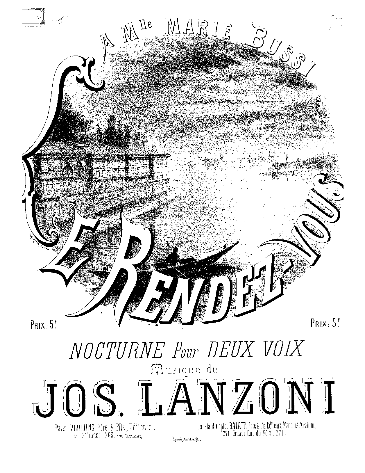 1872 suggested by the information available to BDH and by the plate 2191. 1875 from Publication noted in the Bibliographie de la France 2e série, 64e année, Nº 34, 21 Août 1875, p.498, r.2783. but items sometimes appear twice within a few years in BdlF for one reason or another. (Worldcat does have this in BNF with "1875", and it may have the same plate no. as its one-voice version of the same name (this may or may not be the same exact music? Haven't seen the 1872 version, though it probably has the same plate) - hrm. Actually, going with 1875 above; 1872 for one voice, 1875 for two seems right. This would not be unusual. BDH also says that the texts are in Greek and French; this is also not accurate it seems- they seem to be in Greek and transliterated Greek (or so it seems; a modern Greek transliteration website does not agree with this statement, and gives different choices for Greek from the written transliterated Greek 2nd lines. ... Hrm.)