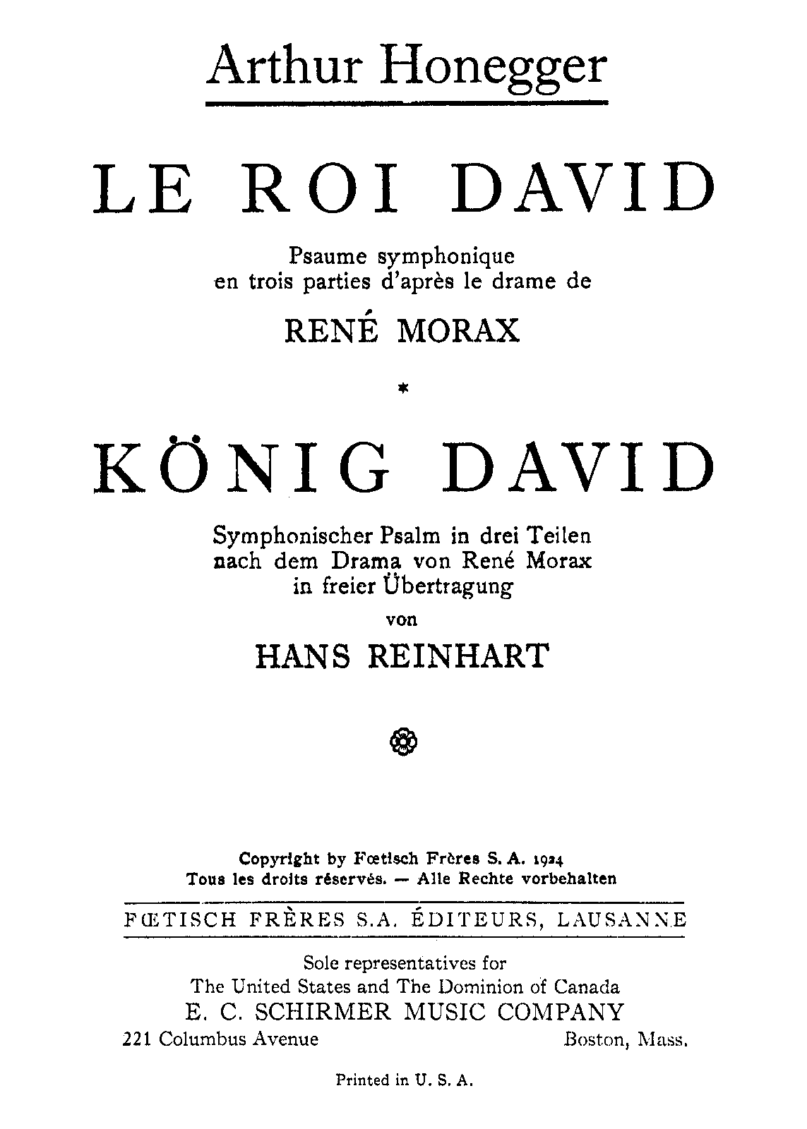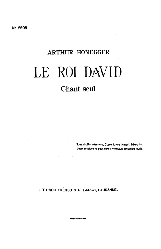 | Extra Information | Originally written for voices and chamber ensemble as incidental music for a play by René Morax. In early 1923, the chamber version was performed as a standalone piece ("symphonic psalm"), with interspersed narration between musical numbers and slight reordering. Later in 1923, Honegger re-orchestrated the piece, and the symphonic psalm for full orchestra was first performed in December 1923. |
