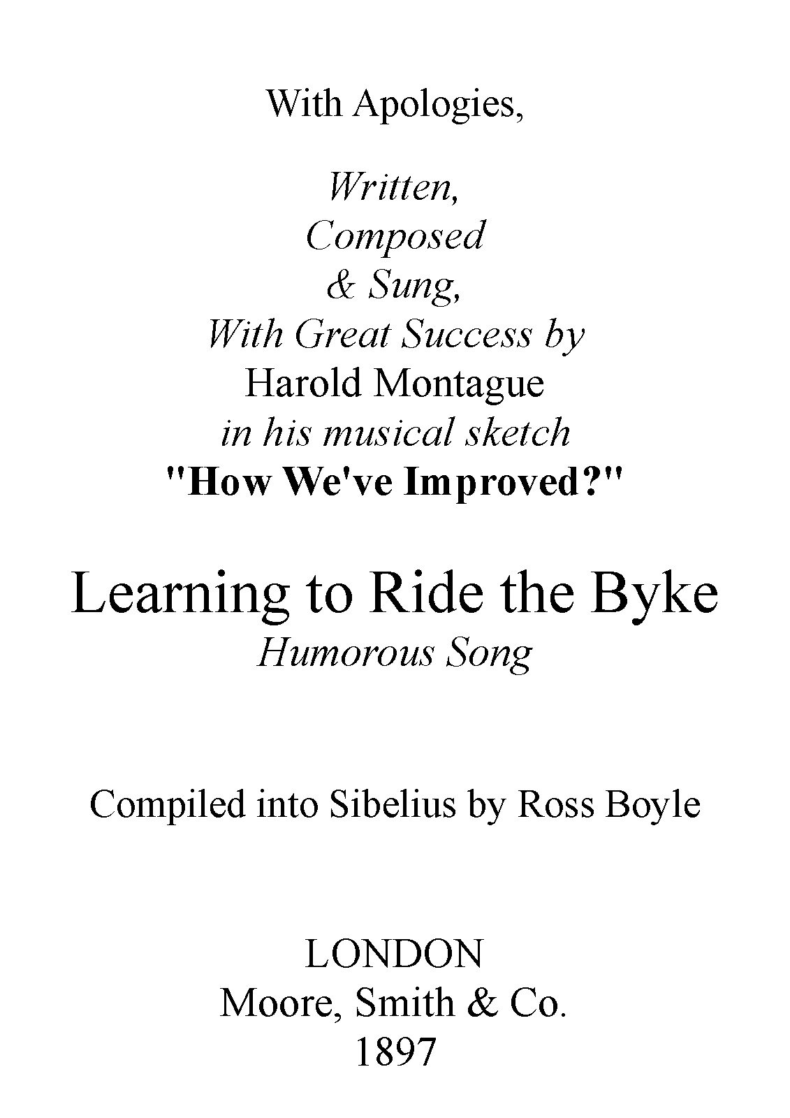 | Extra Information | A nice little ditty about someone learning to ride a bike, when they were still partly a novelty. The lyrics are a parody of Tennyson's "May Queen", once a very popular poem regarding someone becoming a monarch, a May Queen. The epic throne being lampooned into a small child learning to ride a bicycle is definitely amusing. The earliest example of Montague's music before his Vagabonds stardom, where he was seen as a fresh entertainer at the piano similar to Corney Grain. |