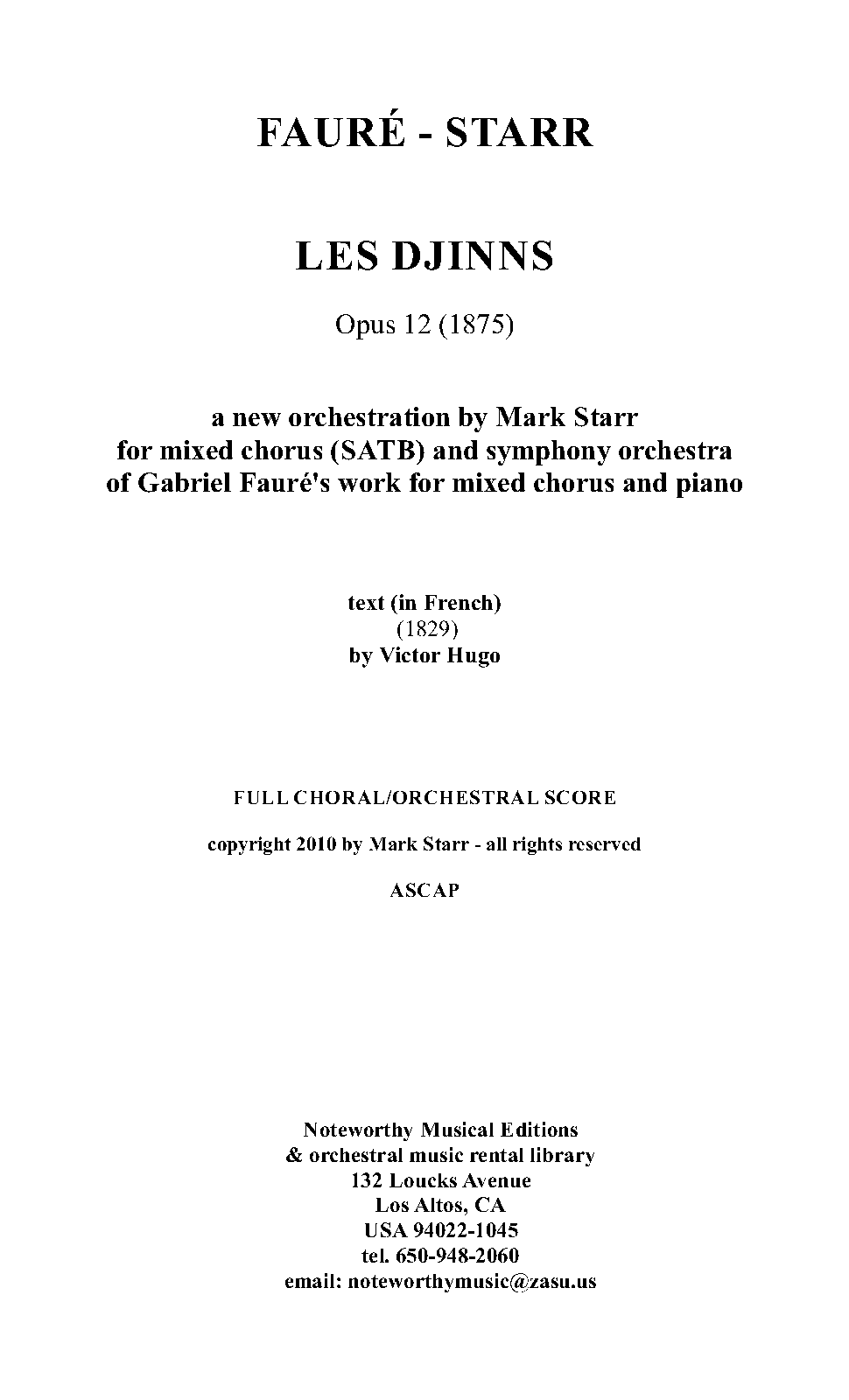 | Extra Information | According to Grove Music, this is listed as "chorus pf/orch", which would indicate an orchestration by Fauré himself, not to be confused with the orchestration by Mark Starr. |