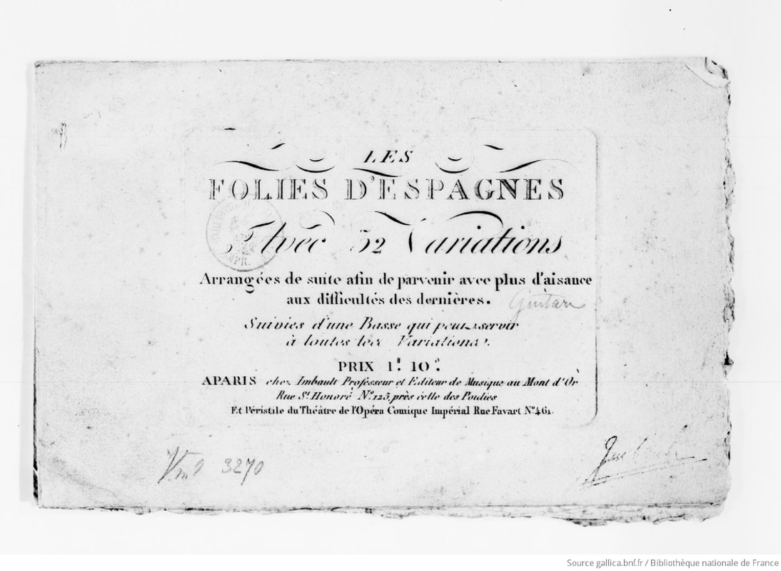 | Alternative. Title | Les Folies d'Espagnes avec 32 Variations arrangées de suite afin de parvenir avec plus d'aisance aux difficultés des dernieres pour Guitare |