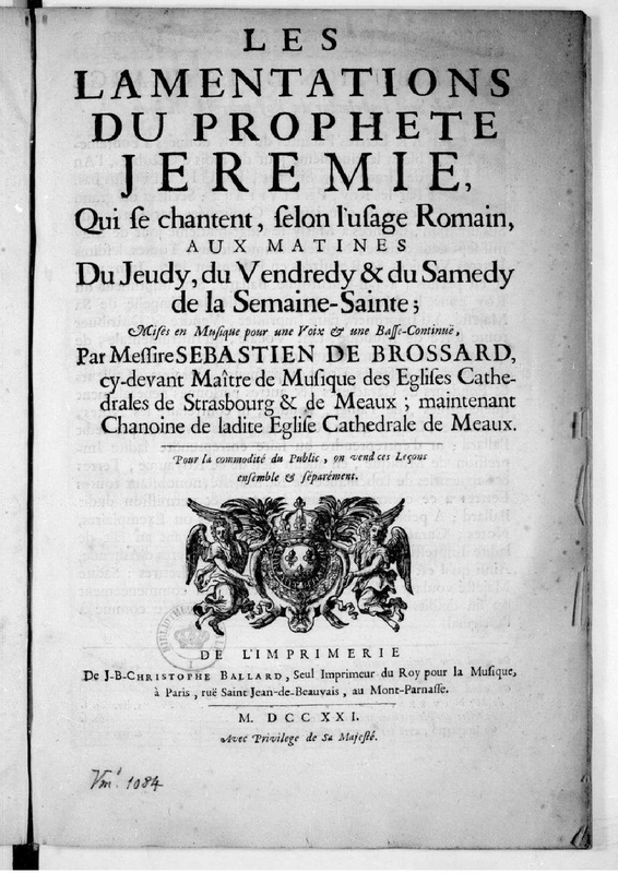 | Alternative. Title | Les Lamentations du prophète Jérémie, qui se chantent selon l'usage romain aux matines du jeudy, vendredy et du samedy de la semaine-sainte mises en musique pour une voix et une basse continue... |