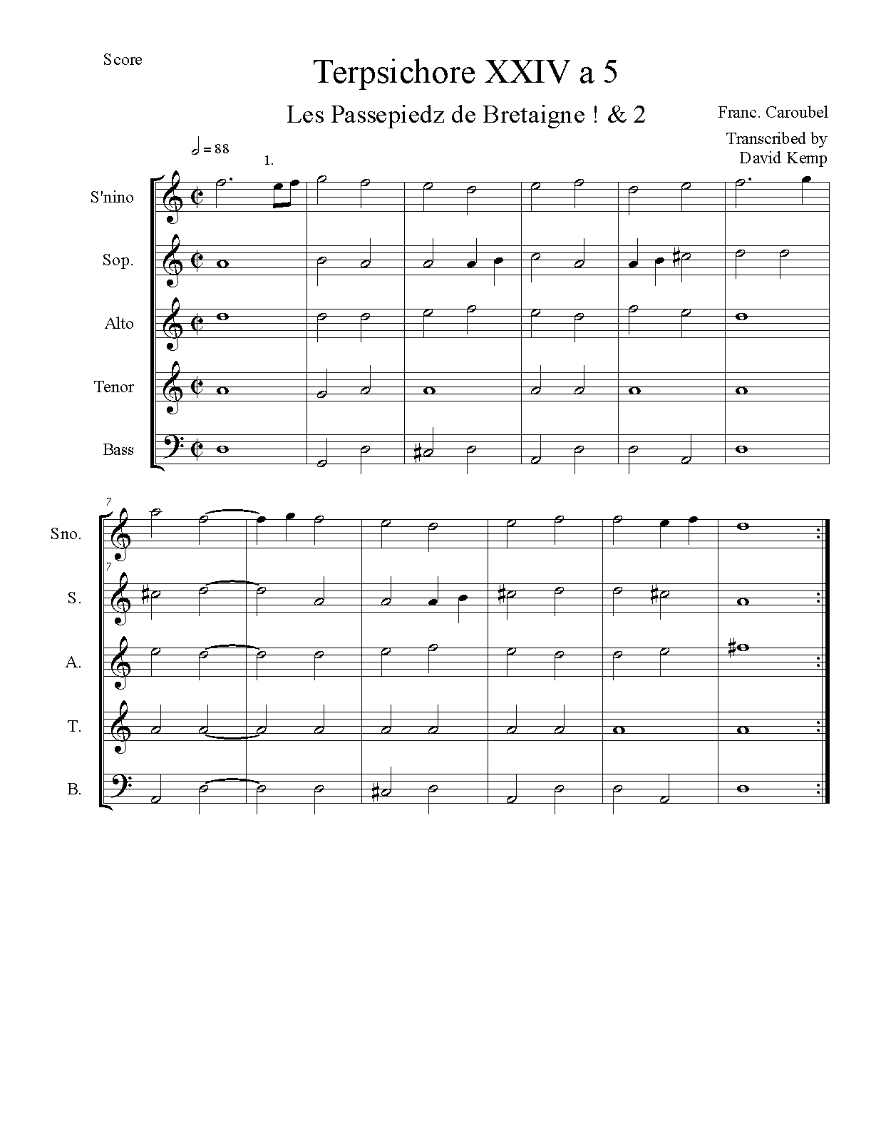 These pieces were assembled and arranged by Praetorius for his 1612 collection. It is unknown how many, or if any, of the works in the collection were actually composed by Caroubel as opposed to being popular dance tunes arranged by him. The instrumentation is not specified in the original, and simply listed as "Ã 5"