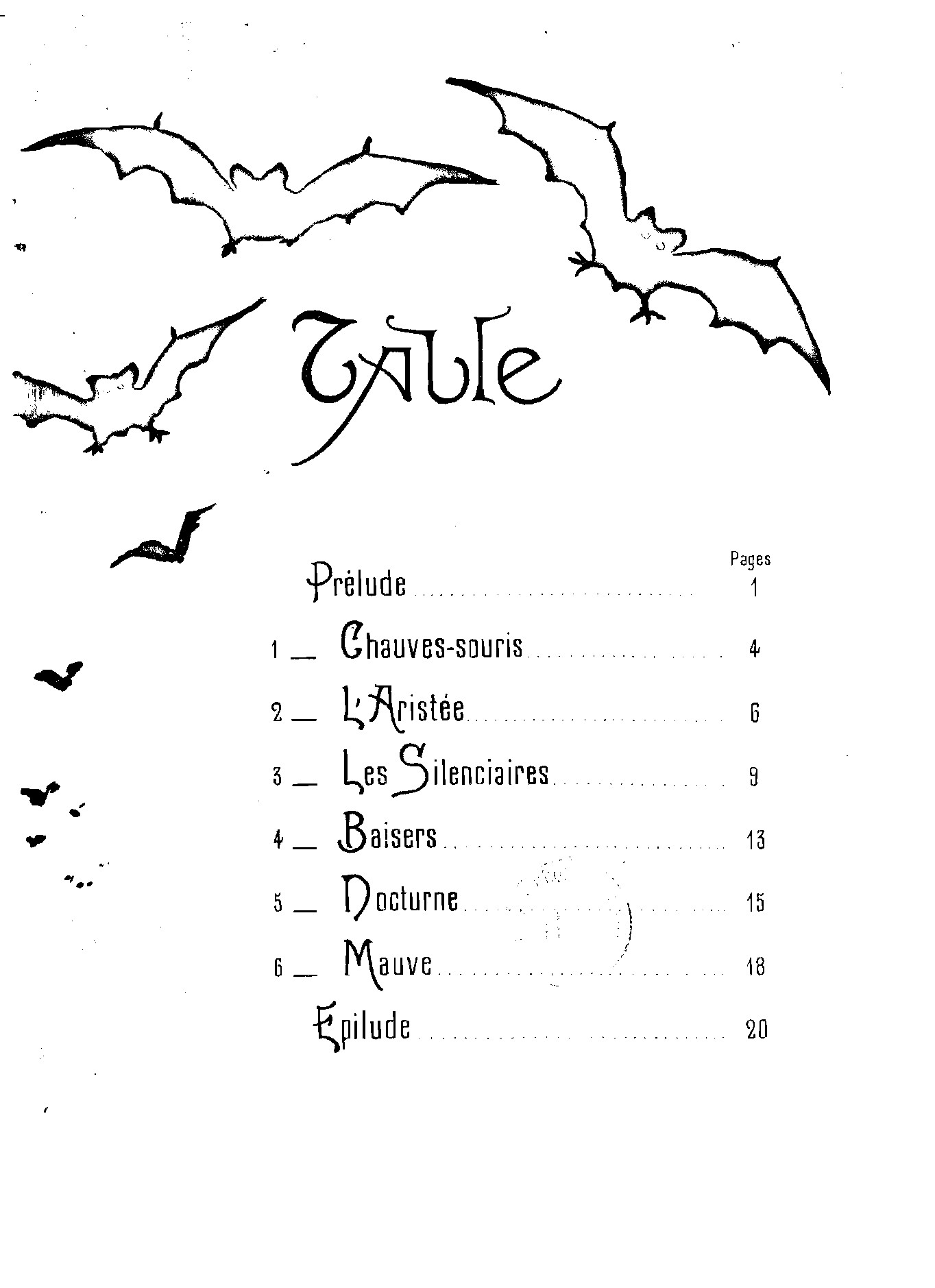 ⇒ 8 more: Prélude • 1. Chauves-souris (à Madame Madeleine Lemaire) • 2. L'Aristée (à Madame la Comtesse de Saussine) • 3. Les Silenciaires (à Madame la Comtesse E. d'Avaray) • 4. Baisers (à M. Marcel Proust) • 5. Nocturne (à M. Maurice Bages) • 6. Mauve • Epilude