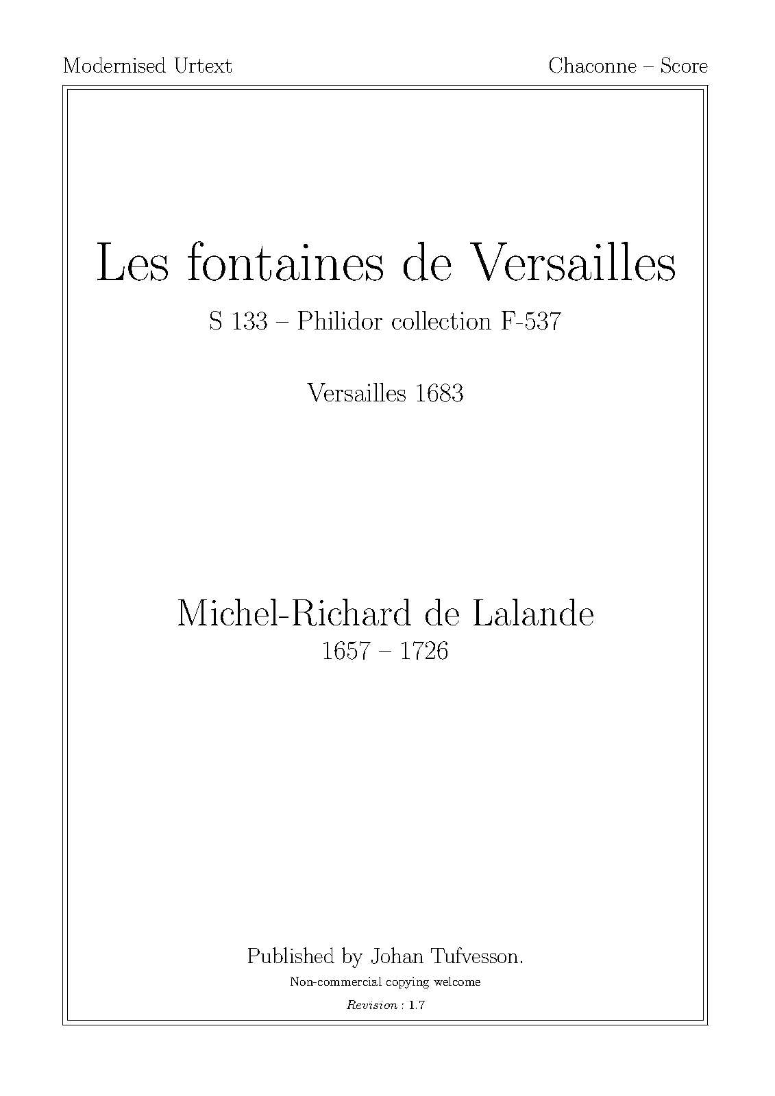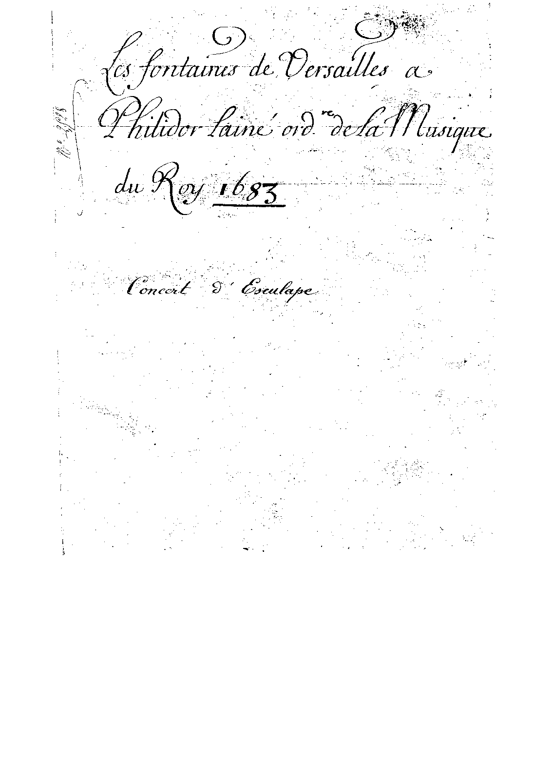 voices, mixed chorus, orchestra - Solists : Latone (Ut 1, Madlle Pluvigny), Flore (Sol 2, Madle Rebel la cadette), Apollon (Sol 2, Monsieur d'Aix), Cerès (Ut 1, Madlle Rebel l'aînée), Ancelade (Fa 3, Monsieur Morel), Bachus (Ut 4, Monsieur Miracle), la Renommée (Sol 2, Madlle Rebel l'aînée), Comus (Fa 3, Monsieur Gaye). - Choeurs : Sol 2 (2), Ut 3 ; Sol 2, Ut 4, Fa 3 ; Sol 2, Ut 3, Ut 4, Fa 4. - Orchestre : Sol 1, Ut 1, Ut 2, Ut 3, Fa 4. - Mentions d'instrumentation sous la musique : dessus de violon, haute-contre et taille [de violon], quinte [de violon], flûtes, hautbois, basson. - Musicians on first representation : violonistes : Messieurs La Quaisse, Marchand Pere et fils, Le Peintre, Huguenet l'aîné et le cadet, Faussart, La Fontaine Pere et fils, Charlot ; hautbois, fluste et basson : Messieurs Philidor l'aîné et le cadet, Nicolas Hotteterre ; clavessin : Mr Buterne ; tuhorbe : Mr Dupré.