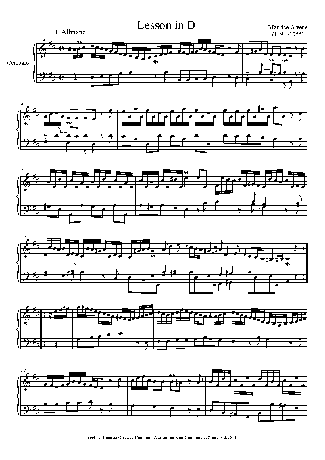 The first lesson from the book, Choice of Lessons for the Harpsicord compos'd by Dr. Greene. Note that this book of music was published without Greene's permission and that the first Minuet was probably added in to fill space.