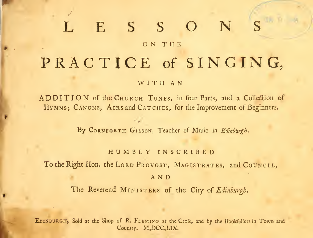 Lessons on the Practice of Singing, with an Addition of the Church Tunes, in four Parts, and a Collection of Hymns; Canons, Airs and Catches, for the Improvement of Beginners. By Cornforth Gilson, Teacher of Music in Edinburgh.