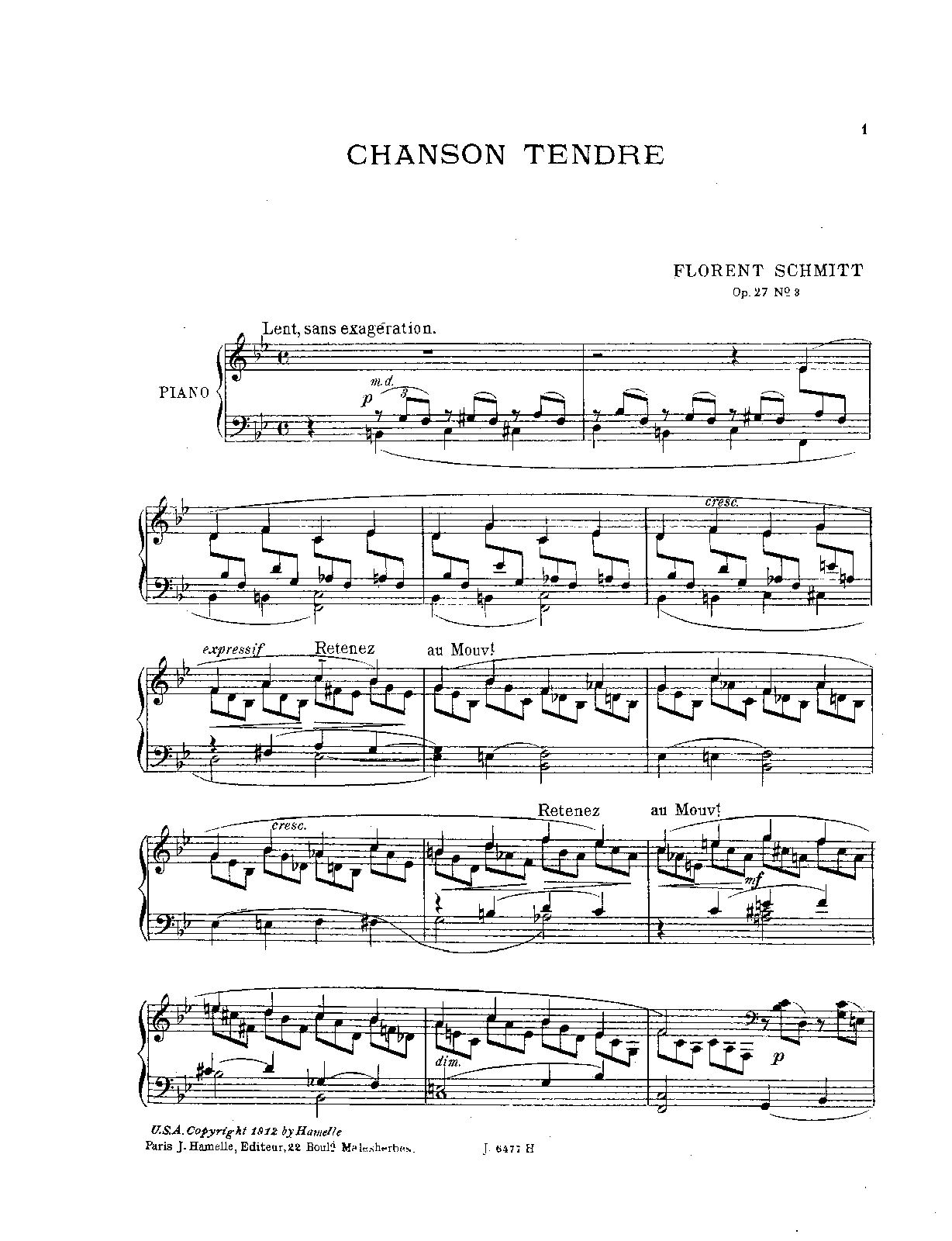 Misc. Notes With title Lied instead of Chanson tendre. Possibly an earlier revision of the composition prior to it being published by Hamelle in 1912.