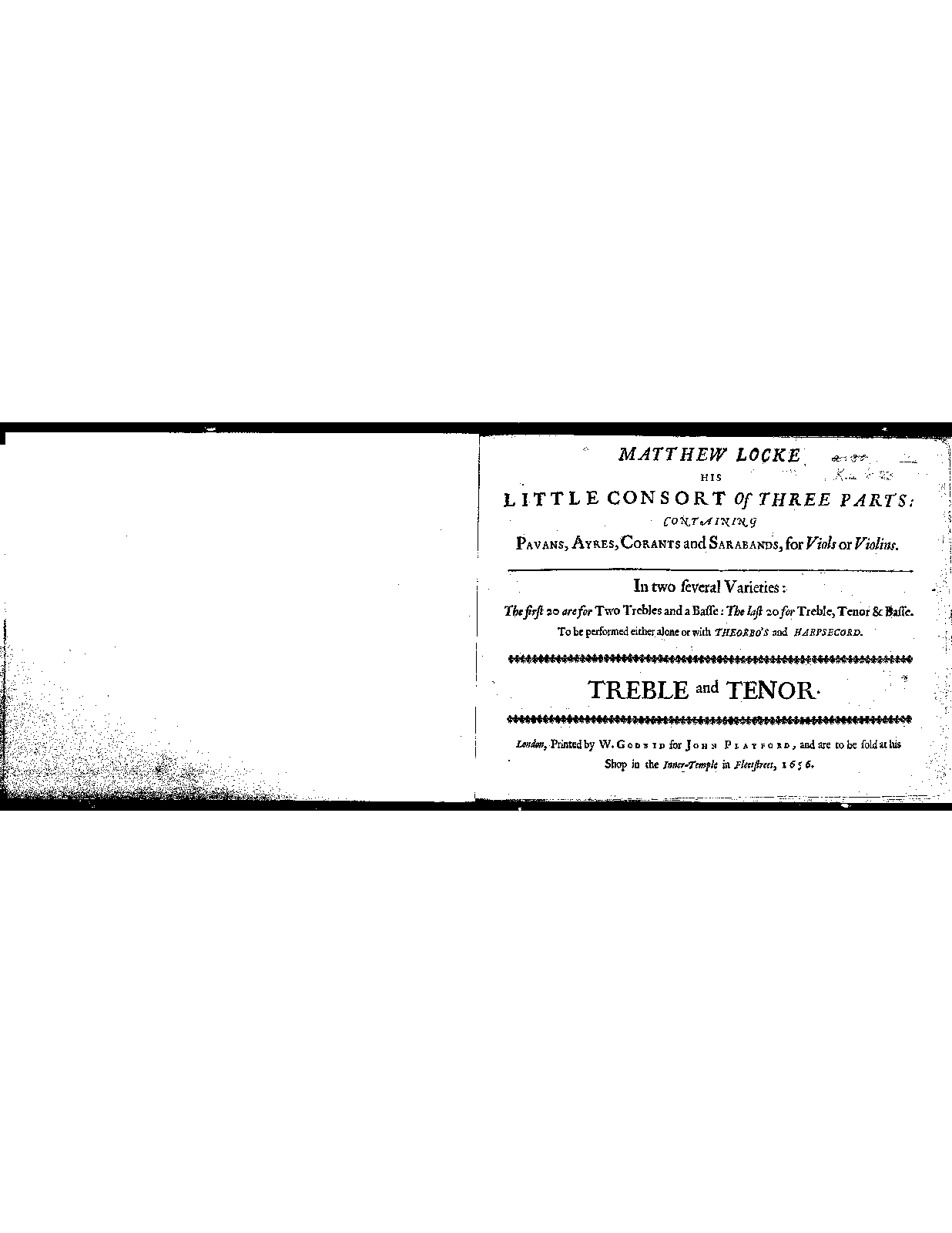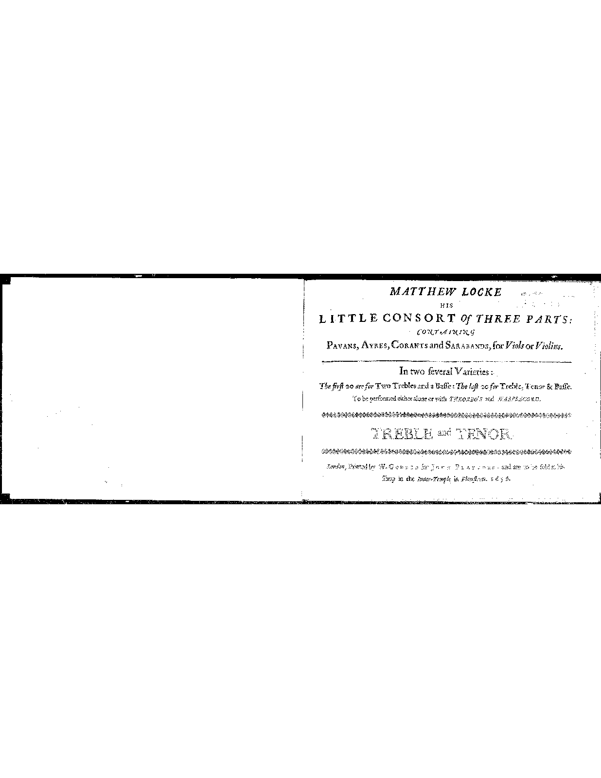 Matthew Locke His Little Consort of 3 Parts: Containing Pavans, Ayres, Corants and Sarabands, for Viols or Violins. In 2 several Varieties: The first 20 are for 2 Trebles and a Basse: The last 20 for Treble, Tenor & Basse. To be performed either alone or with Theorbo's and Harpsecord.