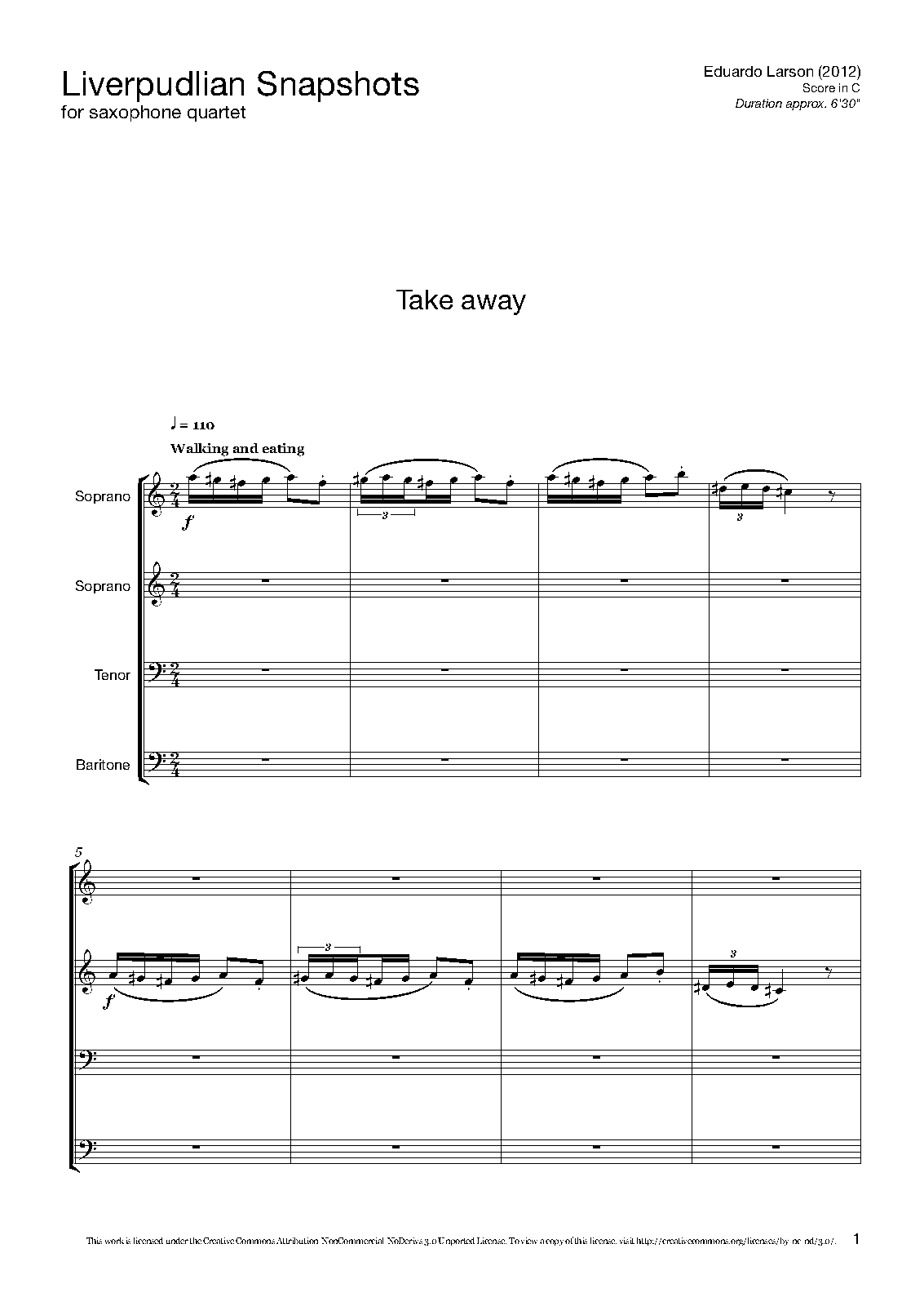 “Liverpudlian Snapshots” is a series of pieces for saxophone quartet that can be defined as an anti-touristic description of the city of Liverpool. Anti-touristic because it is focused on the composer’s daily life experience as a foreigner living in a different country and that may differ from a day-tripper’s point-of-view. Each segment is autonomous and attempts to musically represent visual and sound aspects from different sites, like musical pictures of the city.