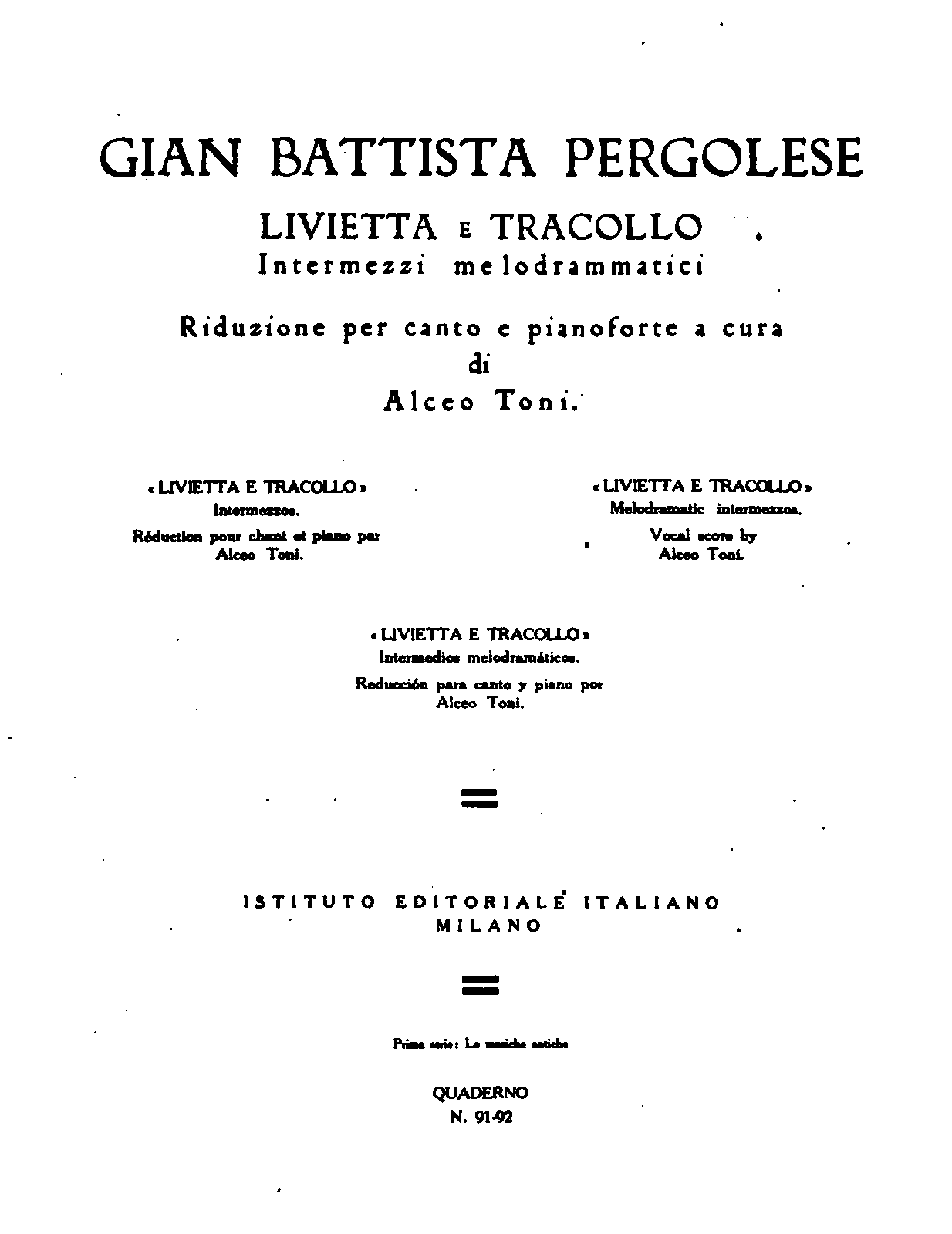 | Alternative. Title | Tracollo; Tracollo e Livia ; Intermezzi melodrammatici; Intermede; Intermezzo a tre |