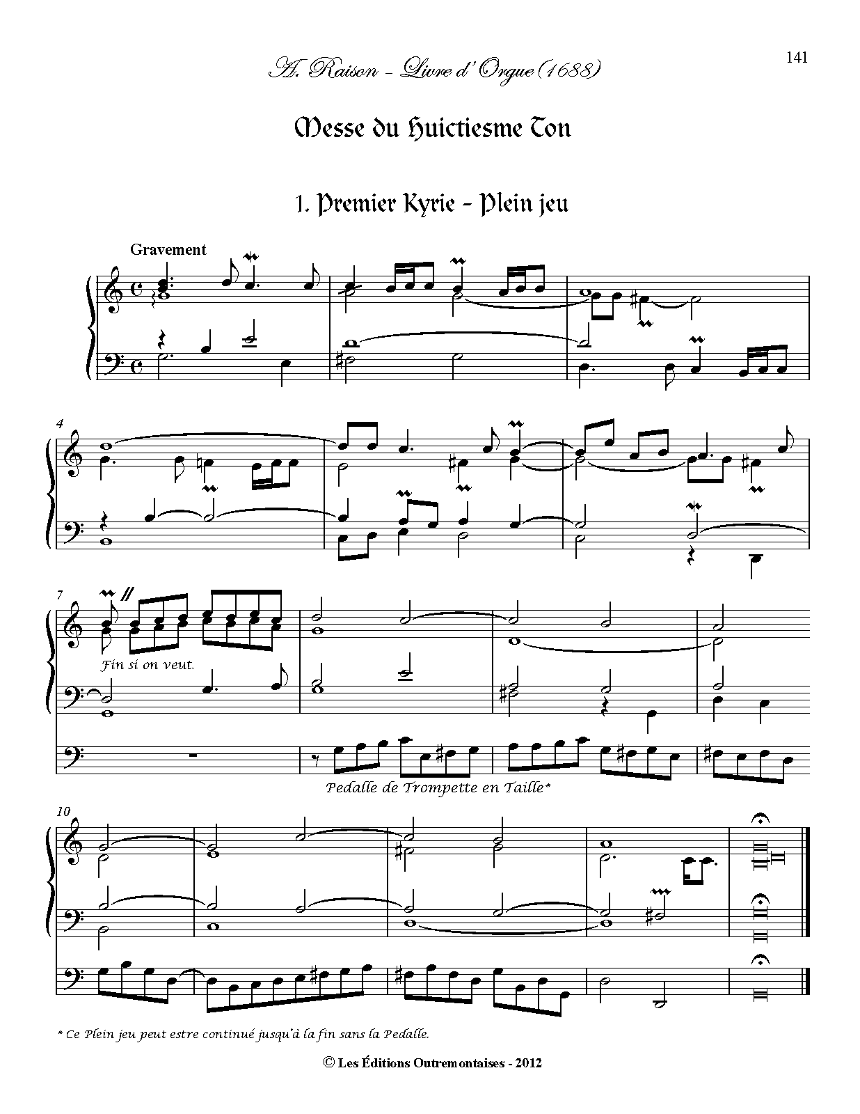 ⇒ 6 more: Second Sanctus - Récit de 2 dessus de Tierce • Benedictus - Fugue pour un Cromorne ou Voix humaine en taille • Élévation (Voix humaine) • Agnus Dei - Plein jeu • Dernier Agnus - Dialogue • Deo gratias - Plein Jeu)