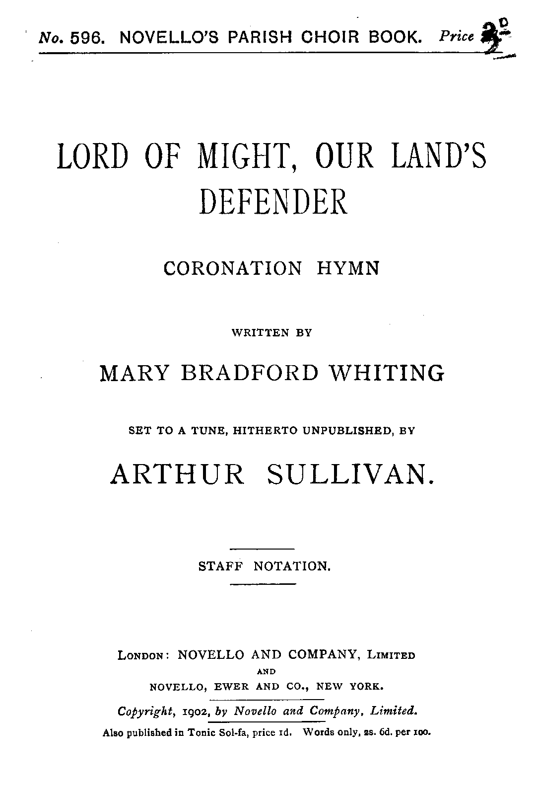 "Written by Mary Bradford Whiting. Set to a tune, hitherto unpublished, by Arthur Sullivan."