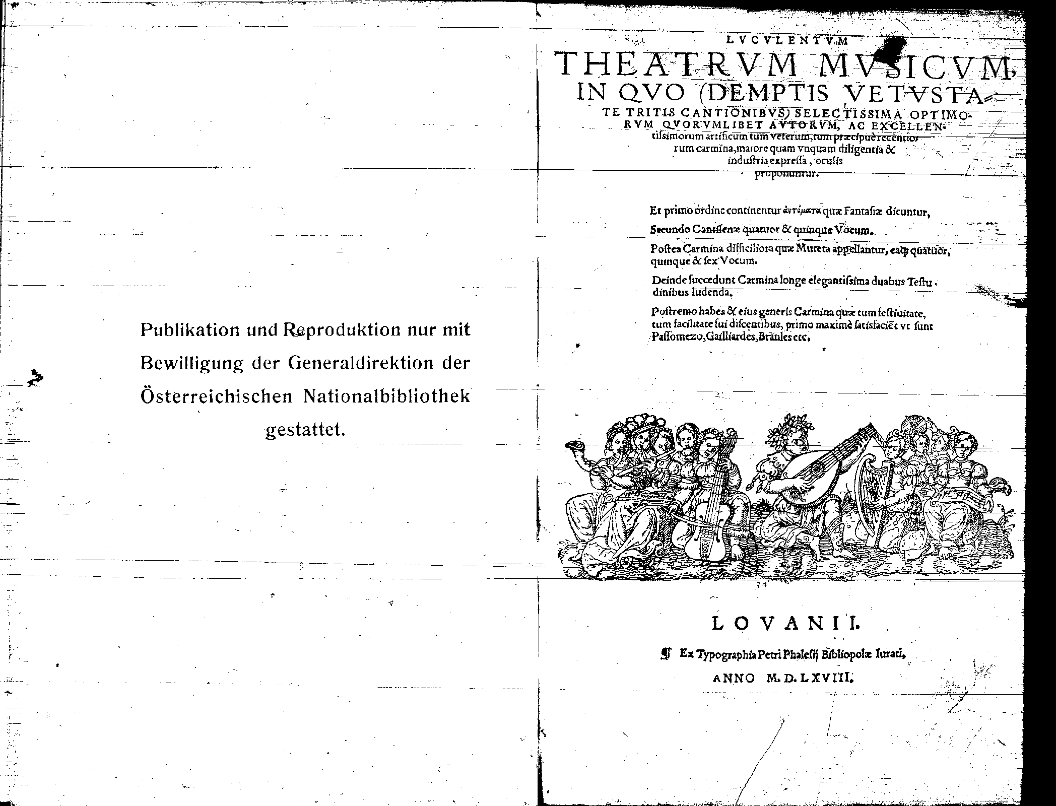 | Alternative. Title | Luculentum theatrum musicum, in quo (demptis vetustate tritis cantionibus) selectissima optimorum quorumlibet autorum, ac excellentissimorum artificum tum veterum, tum praecipue recentiorum carmina, maiore quam unquam diligentia & industria expressa, oculis proponuntur |