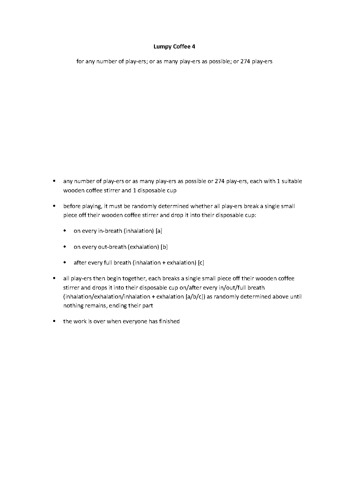 | Instrumentation | any number of play-ers or as many play-ers as possible or 274 play-ers, each with 1 wooden coffee stirrer and 1 disposable cup |