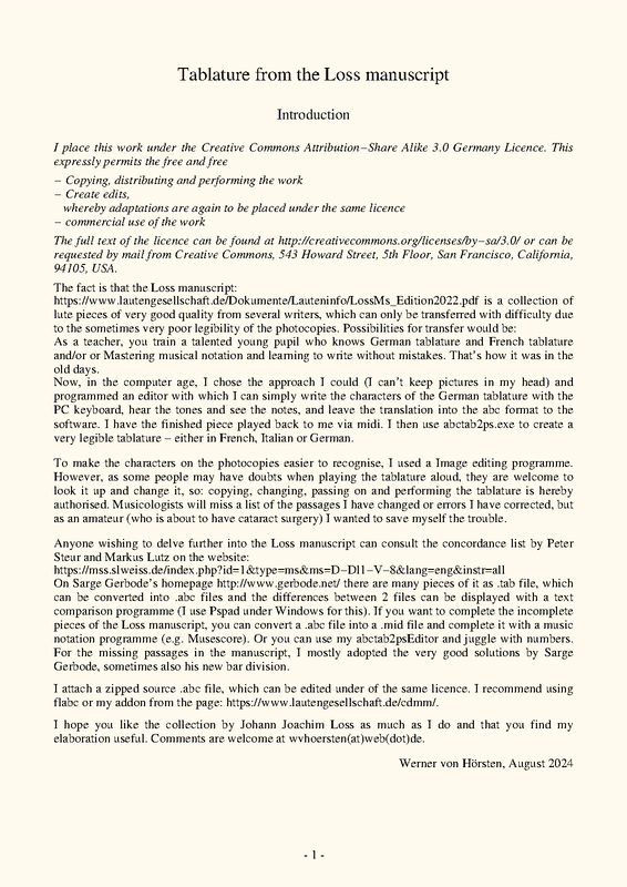 | Extra Information | Tablature from "The Johann Joachim Loss Lutebook", see: https://www.lautengesellschaft.de .The file Tablature_Loss.pdf contains the tablature in pdf format and the file Tablature_Loss_abc.zip contains the same tablature as source in abc format, which can be edited with flabc. |