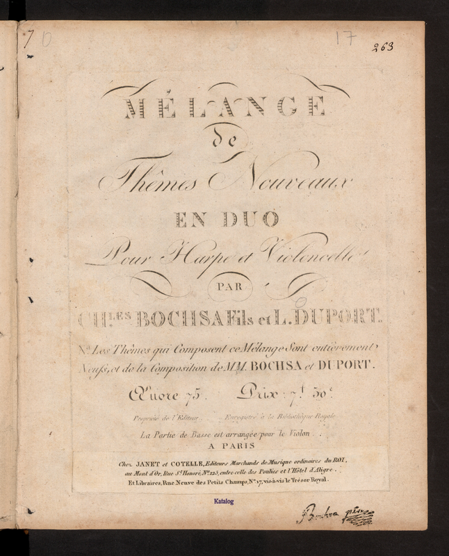 | Alternative. Title | Mélange de themes nouveaux en duo pour harpe et violoncelle par Chles Bochsa fils et L. Duport |