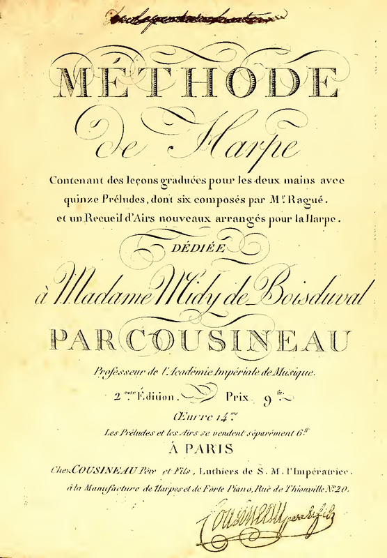 | Alternative. Title | Méthode de Harpe contenant des lecons graduees pour les deux mains avec quinze [15] Preludes, dont six composes par Mr. Ragué, et un Recueil d'Airs nouveaux arranges pour la Harpe |