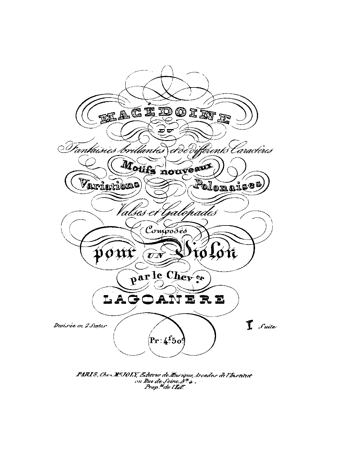 | Alternative. Title | Fantaisies brillantes et de différents caractères, motifs nouveaux, variations, polonaises, valses et galopades, composés pour un violon par le Chevalier Lagoanère. |