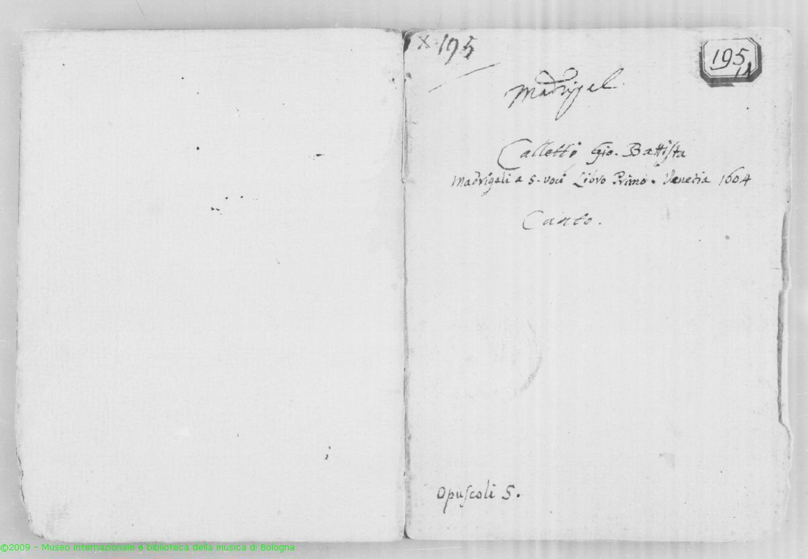 | Alternative. Title | Madrigali a cinque voci di Gio. Battista Caletti detto il Bruno Maestro di Cappella nel Domo di Crema. Libro Primo. Nouamente composti, & dati in luce. - In Venetia, Appresso Ricciardo Amadino. 1604. |