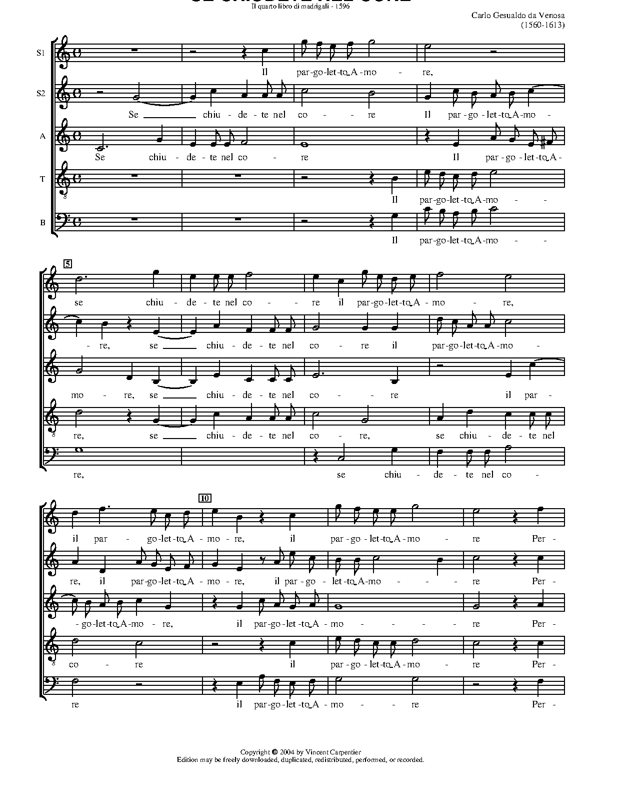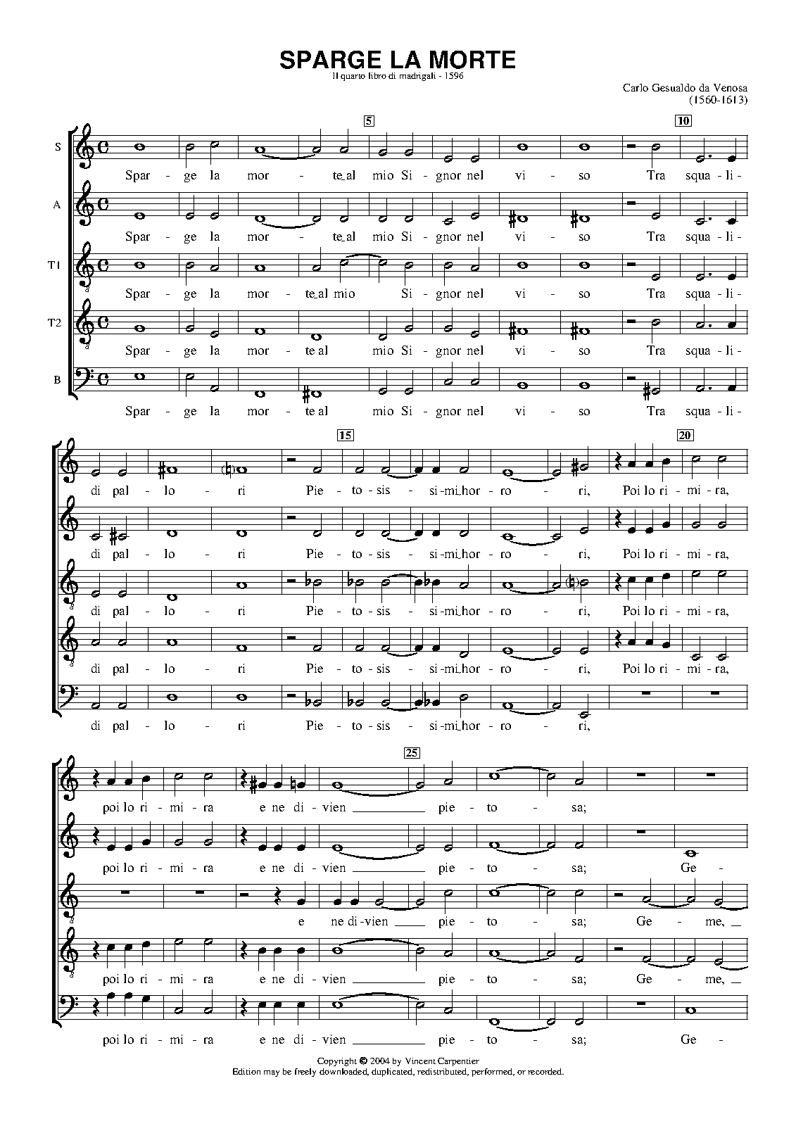 ⇒ 13 more: 2. Tall'or sano desio • 3-4. Io Tacerò • 5. Che fai meco • 6. Questa crudele et pia • 7-8. Or che in gioia • 9-10. Cor mio, deh, non piangete • 11. Sparge la morte • 12-13. Moro, e mentre sospiro • 14. Mentre gira costei • 15. A voi, mentre il mio core • 16-17. Ecco, morirò dunque • 18. Arde il mio cor • 19. Se chiudete nel core