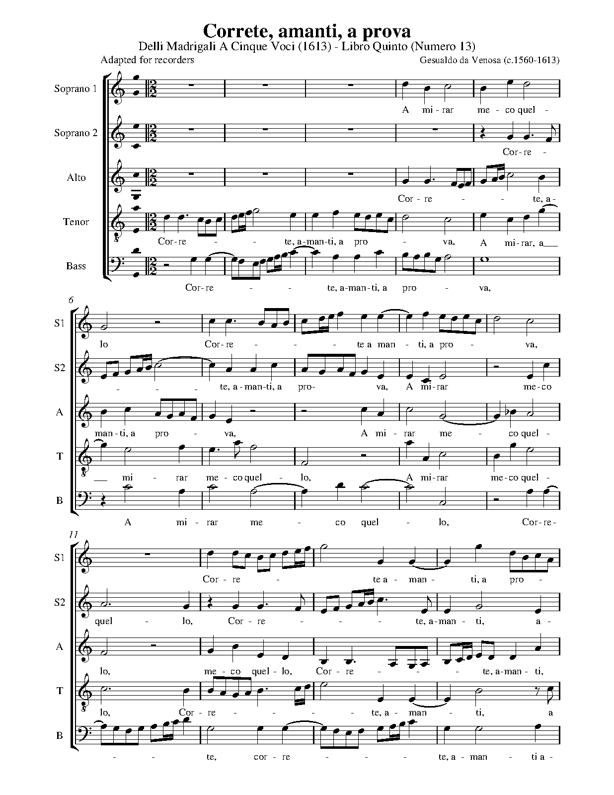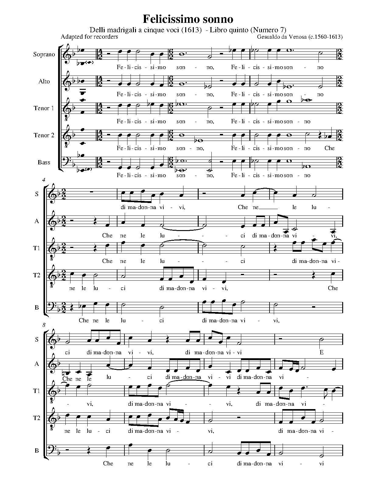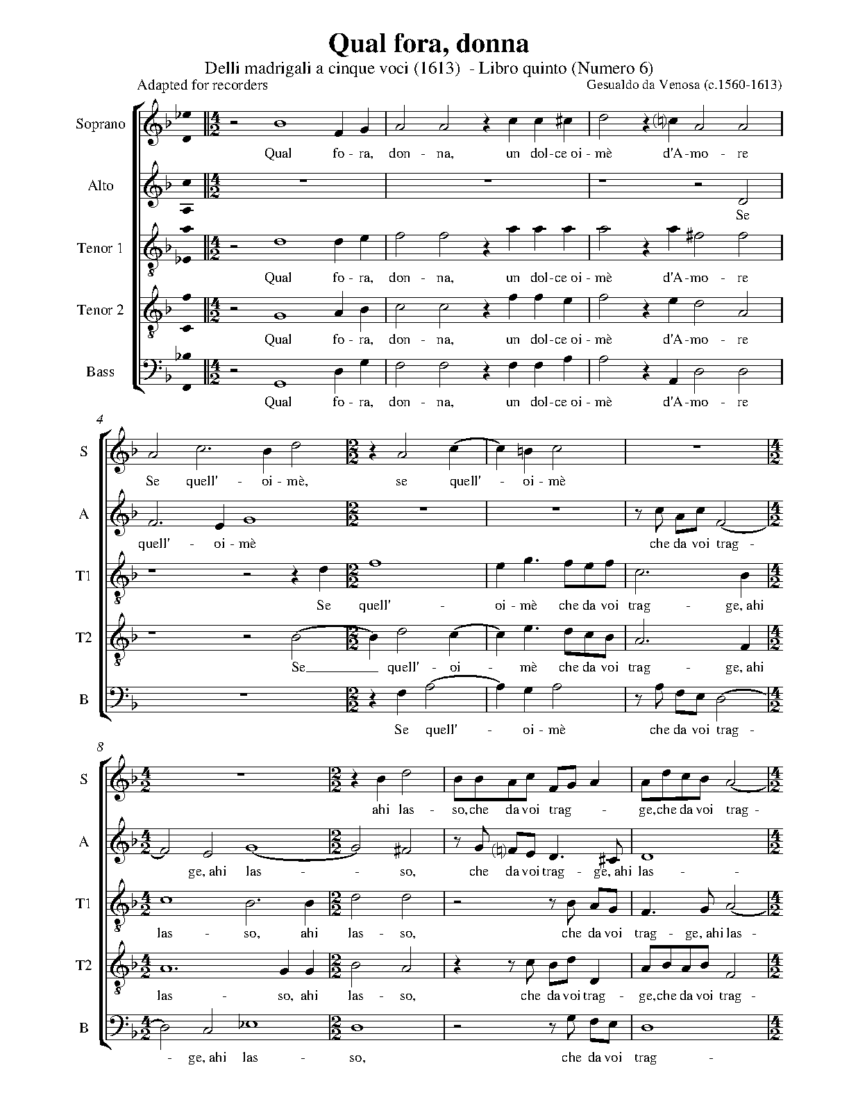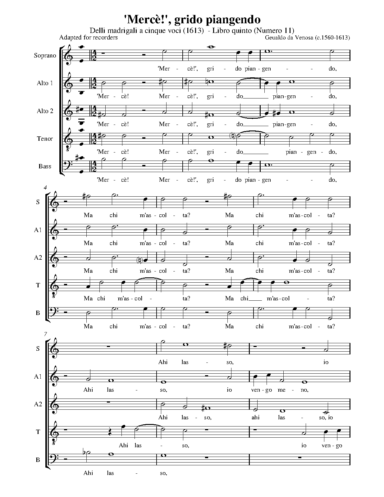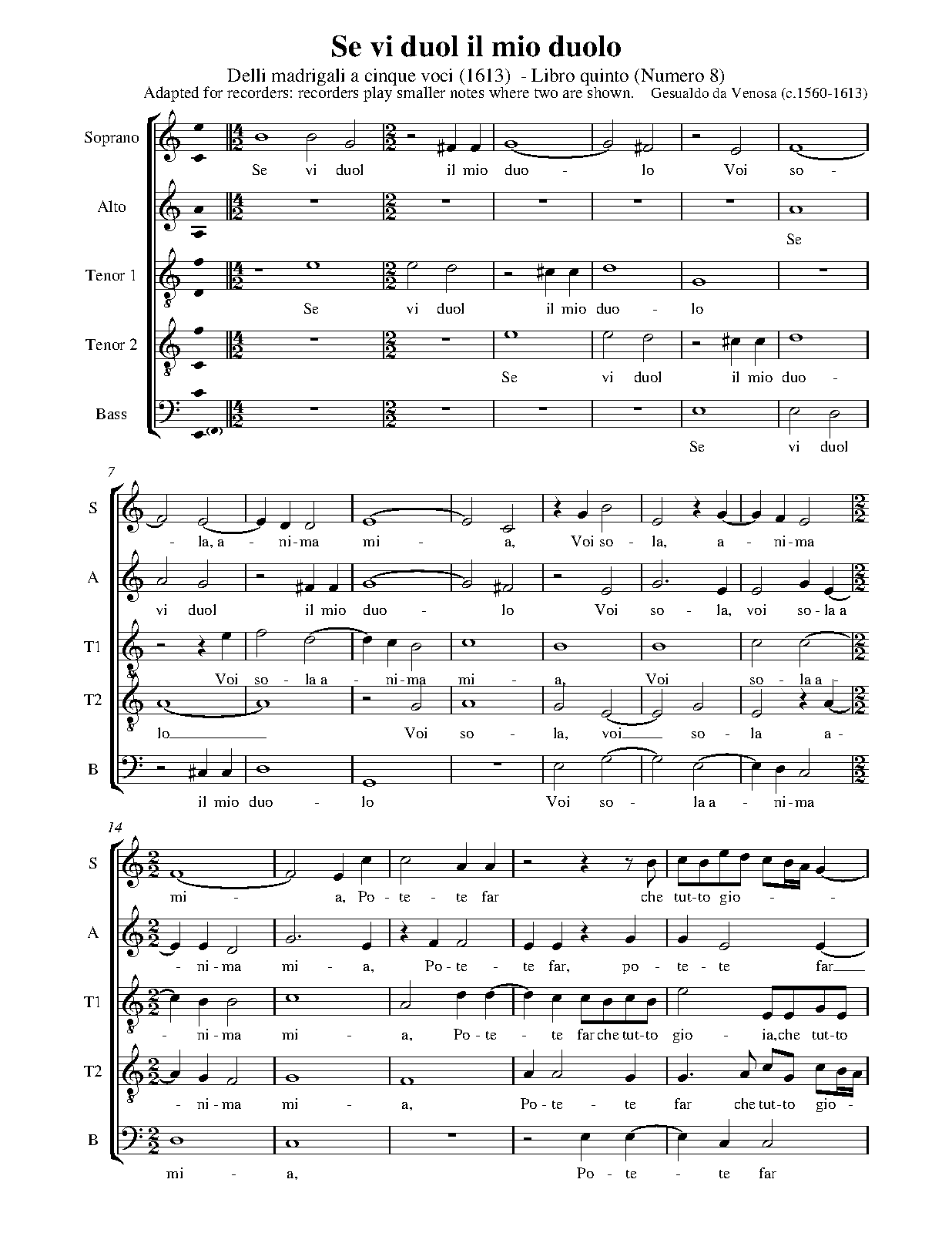 ⇒ 7 more: 18. Ma tu, cagion di quella atroce pena / Complete Score (alto notation) • Soprano recorder • Alto recorder • Tenor 1 recorder • Tenor 2 recorder • Bass recorder • Engraving File (Sibelius)