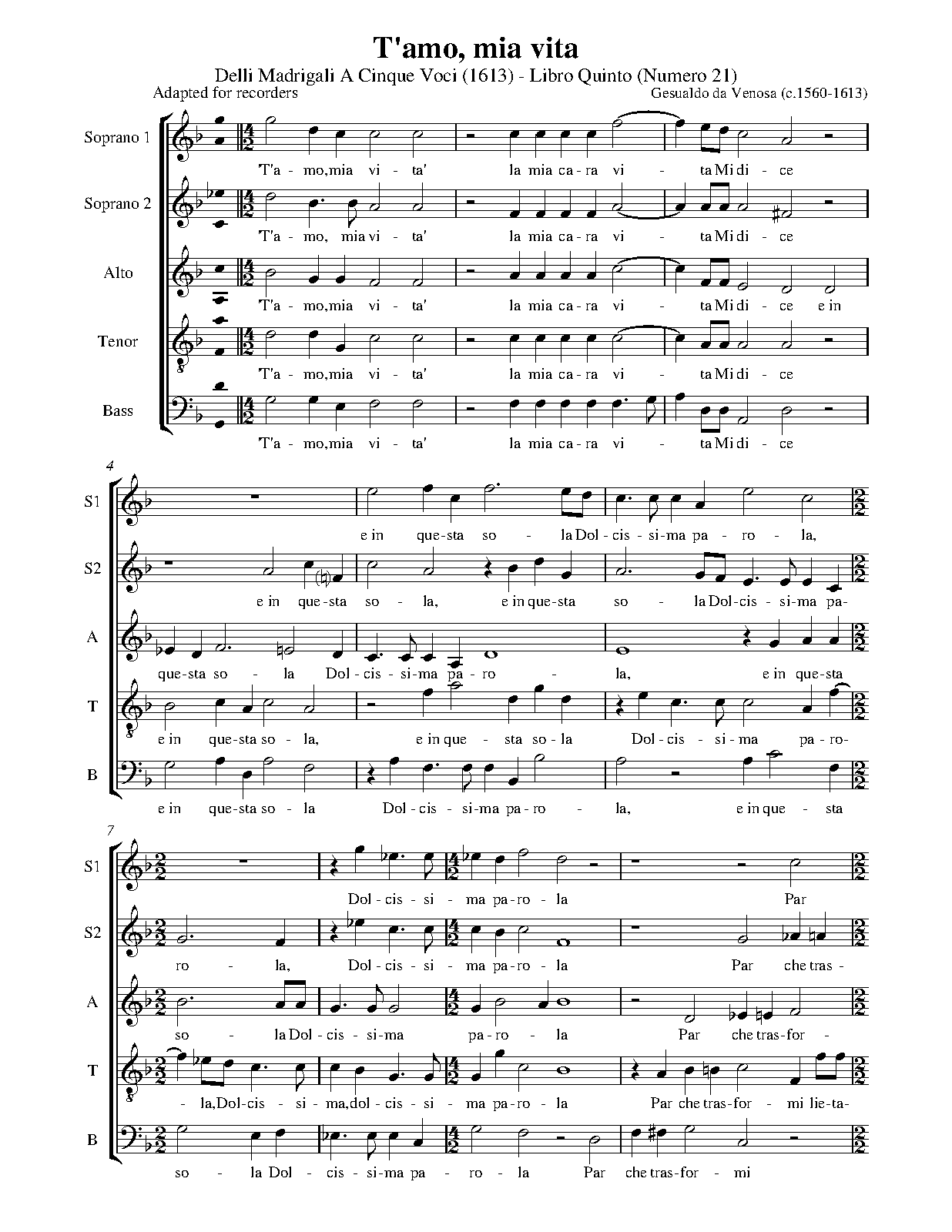 21. T’amo, mia vita - Complete Score (SSATB Recorders)