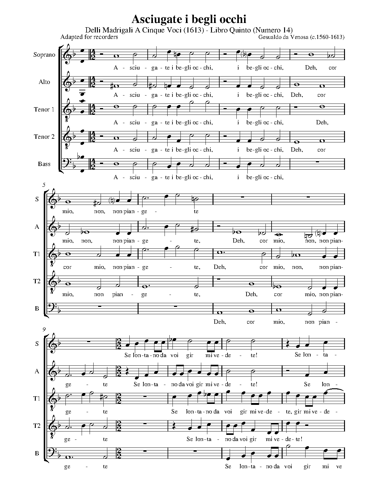 ⇒ 7 more: 14. Asciugate i begli occhi - Complete Score (alto notation) • Soprano recorder • Alto recorder • Tenor 1 recorder • Tenor 2 recorder • Bass recorder • Engraving File (Sibelius)