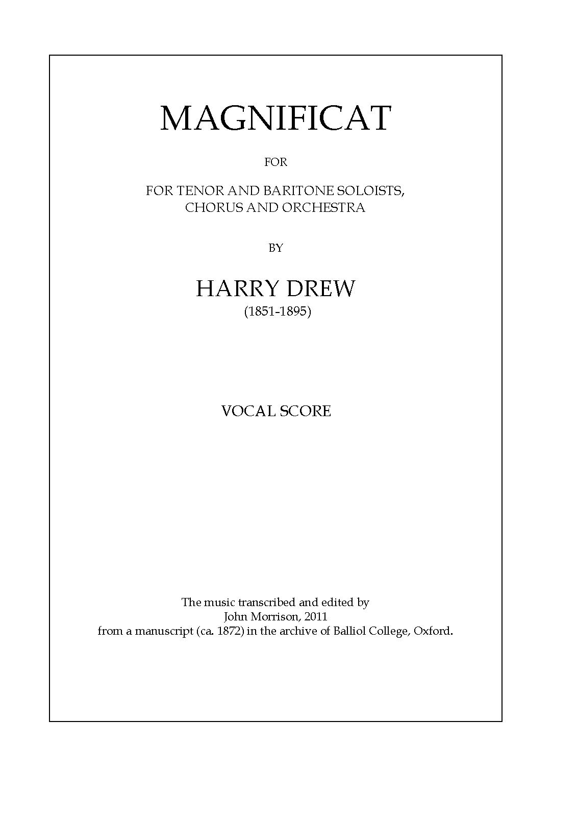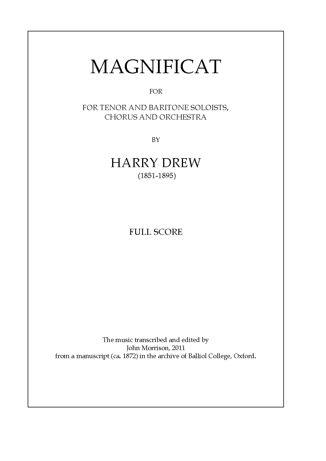 Manuscript score of a setting of the Magnificat by Harry Drew (New College 1872), no date. He appears to have studied music at Oxford in ca.1887-88, and was associated with Balliol College*, but the college has no record of his membership; Faculty of Music recordkeeping for the period is idiosyncratic. The score is assumed to be in the composer's hand and is a fair copy, perhaps submitted as part of a degree; the cover title clearly associates him with Balliol College. It is not known who made the annotations or why. Balliol has no other information about Harry Drew.