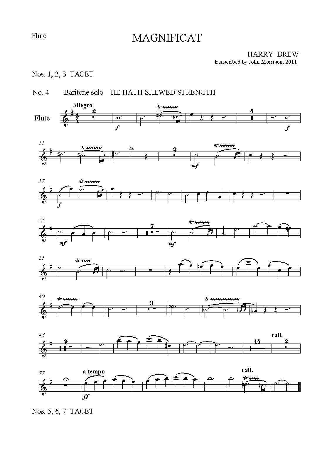 ⇒ 7 more: 2. Solo: For behold (Tenor) • 3. Canon, two in one: And his mercy (Chorus SATB) • 4. Solo: He hath shewed strength (Baritone) • 5. Recitative: He hath filled the hungry (Tenors and basses unison) • 6. Quartet: He remembering his mercy (SATB unaccompanied) • 7(a). Glory be to the Father (Chorus SATB) • 7(b). Fugue: As it was in the beginning (Chorus SATB)