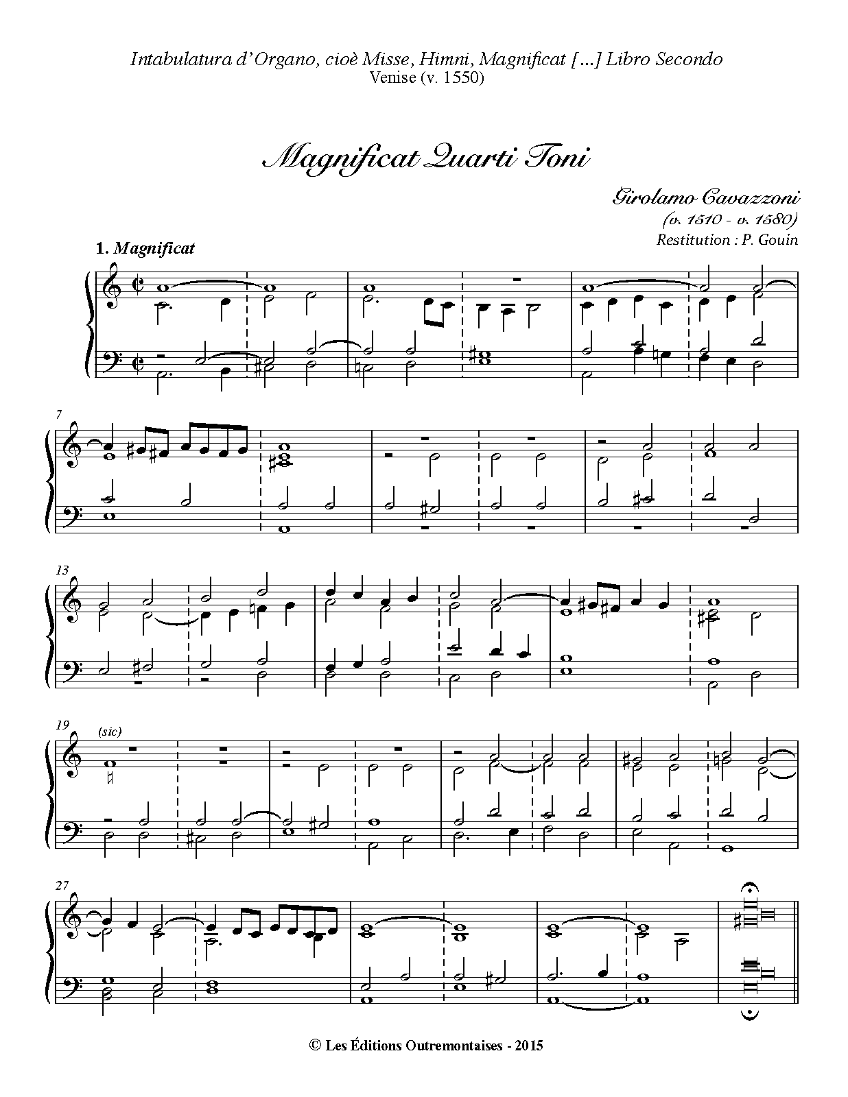 | First Publication | 1550 ? in Intabulatura d'organo cioè misse, himni, magnificat (No.12) |