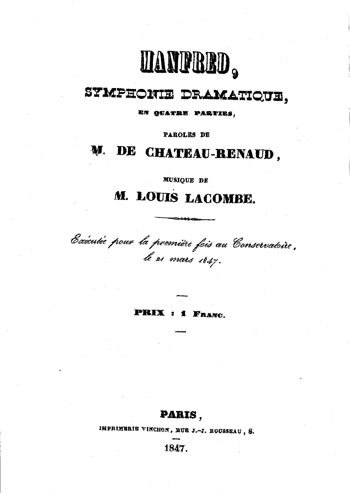 | Alternative. Title | Manfred : symphonie dramatique (chorus and orchestra) en cinq parties, œuvre posthume, op. 77 (pub.1888) ("Paroles de M.M. Jules Barbier de Chateau-Renaud et Adolphe Queyroy ... Grande partition exécutée pour la 1ère fois au Conservatoire. Le 21 Mars 1847 ...") |