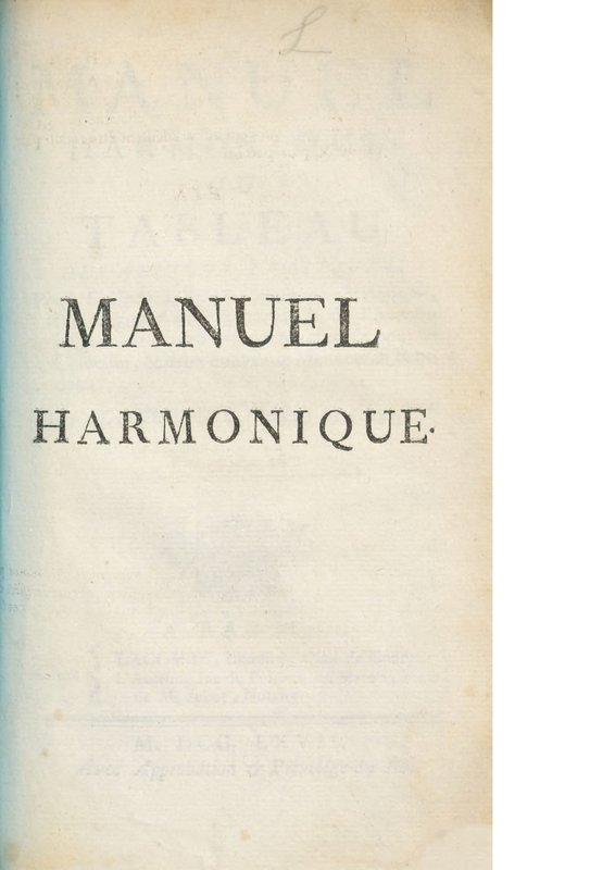 | Alternative. Title | Manuel harmonique, ou tableau des accords pratiques, pour faciliter a toutes sortes de Personnes, l'intelligence de l'Harmonie & de l'Accompagnement, avec une partie chiffree pour le Clavessin, & deux nouveaux Menuets en Rondeau |